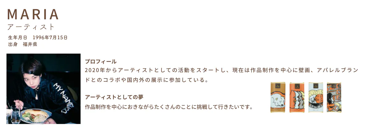 今回のリターン品には新製品をご用意しました。新たに4名のアーティストたちを迎え、パッケージを追加します。ショコラミーツのパッケージはこれで全8名のアーティストのアートパッケージ・全32種類に増えます。それではアーティストたちをご紹介します!