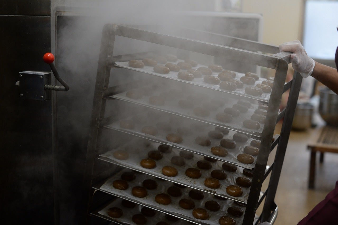 看板商品のひとつ「かりんとうまんじゅう」。蒸しあげたあと自然乾燥させて水分を抜きます