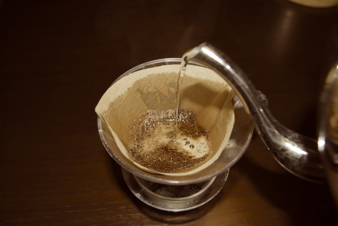 良質な挽きたての粉を使うと、コーヒー豆の細胞の中の炭酸ガスが粉を押し上げてきますので、溢れないようにお湯をゆっくり注ぎます。