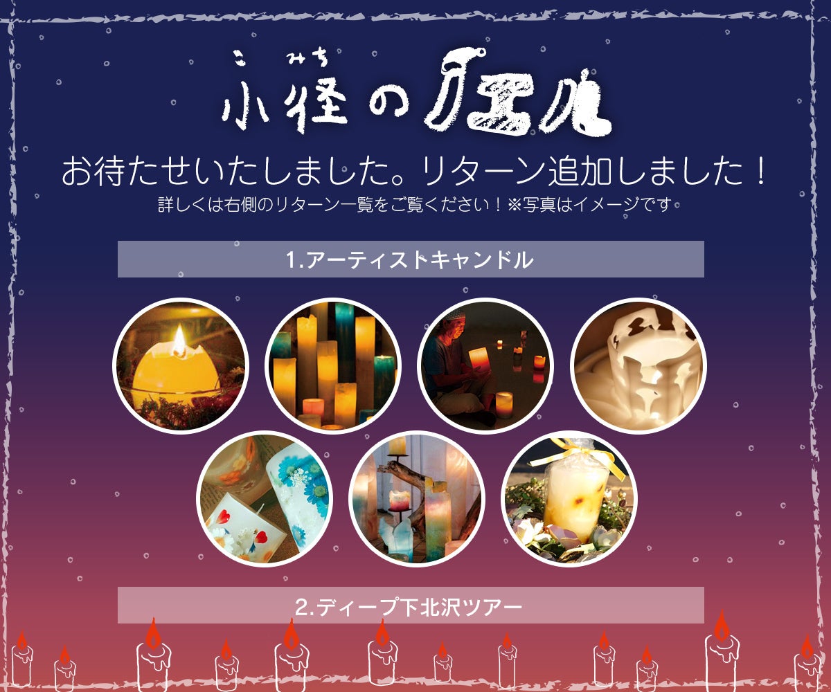 ※リターンには、キャンドルアーティストの手作りのキャンドルもあります。ちょっと素敵な夜の灯りに、お使いください。