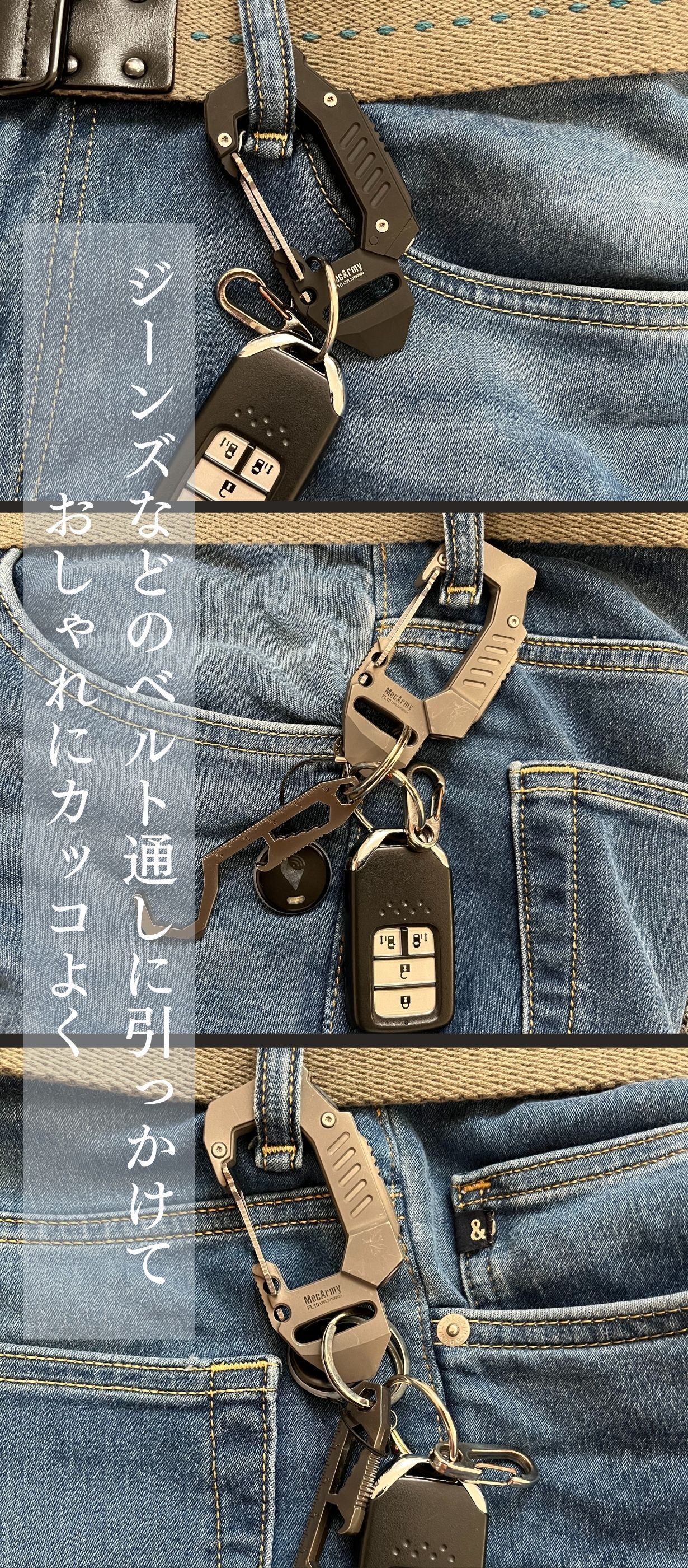カラビナはアウトドア、登山、キャンプ、ファッションと様々な場面で活躍します。主にキーホルダーとして自宅の鍵や車の鍵などまとめて管理でき、ジーンズやバック、リュックなどに引っかけておしゃれでカッコよく使用できる便利なアイテムです。