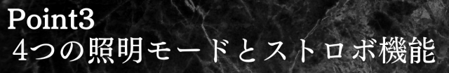 明るさは4段階の調整ができ、ストロボ機能も搭載。