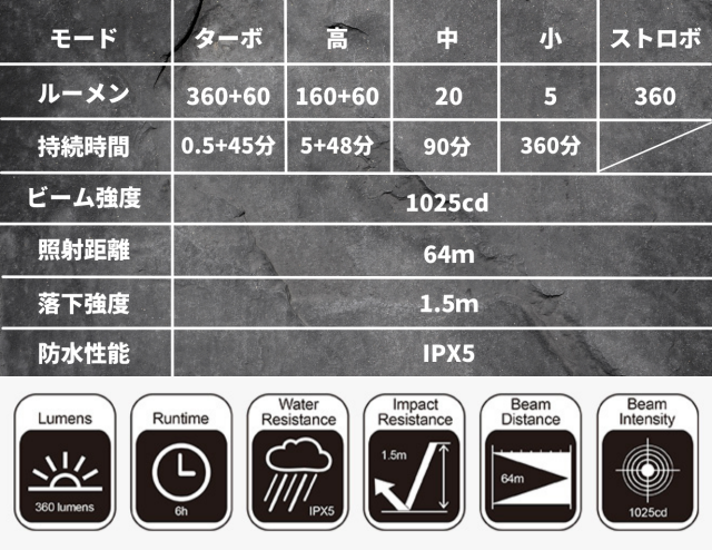 (ターボ設定と高設定はライトが高温になるのを防ぐためにオーバーヒート防止機能が働き、ターボ設定で30秒、高設定で5分経つと自動的にルーメンが60ルーメンまで徐々に下がります。その状態で持続時間まで点灯可能です。ゆっくり下がりますので明るさは保たれたままでバッテリーを長持ちさせます)