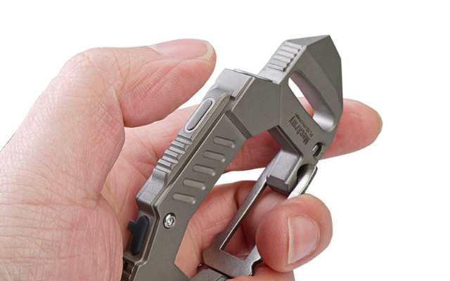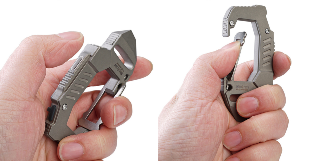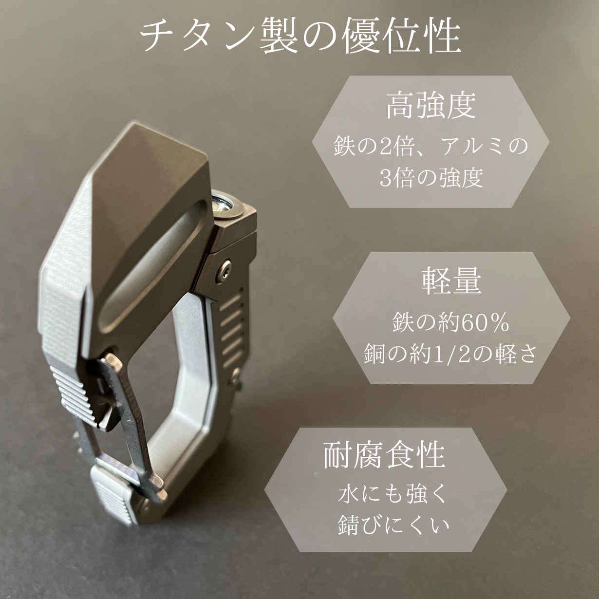 カッコいいデザインで、カラビナにLEDライトを搭載、強靭なチタン素材で全体を武装、ワイルドでタフ、多機能ツールとして日々の生活に便利さと刺激を与えます。