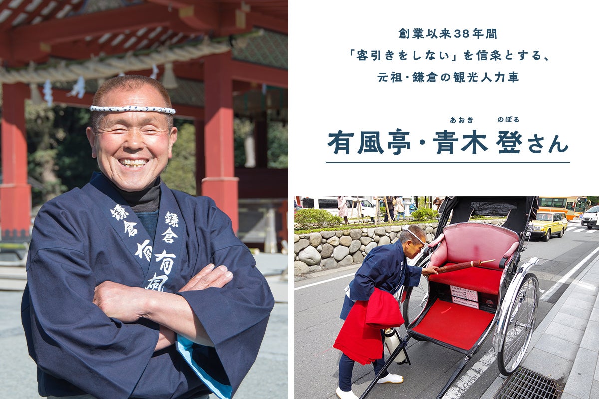 鎌倉通なら知らない人はいない(と、言っても過言ではない)名物人力車夫がいます。それが、有風亭の青木登さんです。青木さんは昭和58年の創業以来、個人事業の人力車夫として、鎌倉観光の第一線で活躍しつづけてきました。頑なに「客引きをしない」という信条を守り、地道に、実直に営業をつづけてきたからこそ、地元住民や商店主さんたちから厚い信頼を寄せられています。青木さんが創業した当時は、鎌倉はおろか、京都や浅草にも同業の観光人力車はなかったといいます。その後フラインチャイズチェーンの同業他社が鎌倉に進出した際も、収入面では大打撃を受けてしまいましたが、持ち前の明るさと鎌倉を愛する方々の支えにより、難局を乗り越えてきました。私、古谷も個人的に乗せていただいたり、子供の七五三でお世話になったりしているのですが、実際に青木さんの引く人力車に乗せていただくと、まさに異次元の体験が味わえます。その走りはまるで空を流れる雲のようになめらかで、快適そのもの。そして、後ろに目でもついているのではと疑いたくなるほど、周囲や後方への目配り、気配りが素晴らしいのです。創業から38年間、無事故・無違反を貫いているのもうなずけます。そんな人力車界のパイオニアであり、レジェンドである青木さん。今回のプランでは、青木さんが引く人力車のペア乗車券をご用意させていただきました。30分コースで、ルートはお好みでも、青木さんにお任せでも。普段とはちがう視点から見る鎌倉の景色は、きっと新鮮な体験をもたらしてくれることでしょう。そして青木さんの軽妙な語り口と、人懐こいキャラクターにぜひ癒されてみてくださいね。