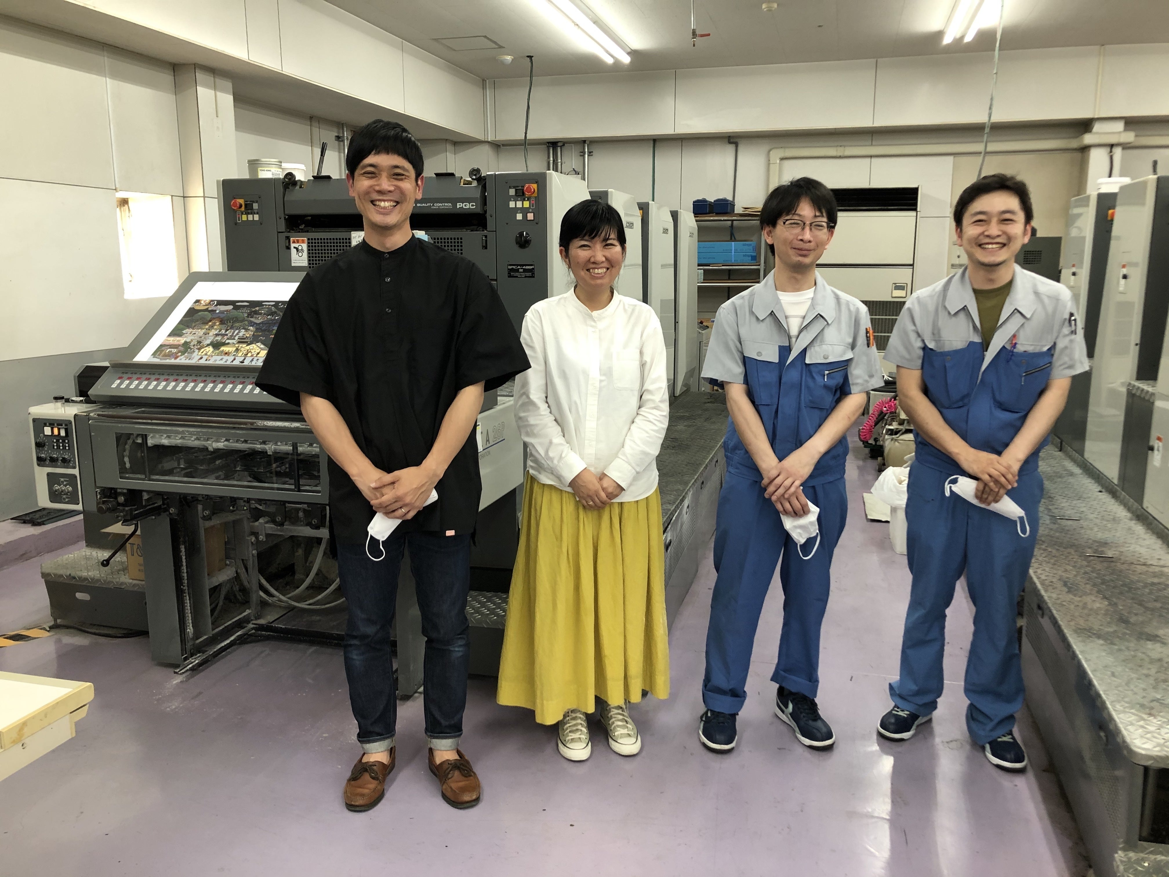 皆さま、こんにちは!妹尾です。先日印刷の確認をしに東湘印版さんに行って参りました。本が出来る工程を始めて直に見て、さながら工場を貸切で社会科見学させていただいたような大変貴重な体験をさせていただきましたので、皆様にも是非その様子をお届けできればと思います!まず工場内がこちら!これが印刷機です。4台並んでいるのが見えますが、奥から黒、青、赤、黄色、のインクが入っており、黒の上に青を塗り重ね、その上に赤を塗り重ね、その上に黄色を塗り重ねて印刷が完成するという仕組みになっています。そしてそれぞれの機械にはこのようにアルミ製の版がセットされており、それぞれの色をページのどこにどの程度乗せるのかがわかります。絵本の色は、データを印刷するとそのままその色が出てくるのではなく、印刷機の特性やインクの種類などあらゆる要素が重なって表現されるので、表紙の色を表現する為に何度も調節が必要になります。特に表紙の色はこだわりにこだわって、数時間にも及ぶ調整の末ようやく決定することができました。一切の妥協なく真摯に対応してくださった社員の皆さまには心から感謝です!色が決まると即!本番の印刷が始まります。どんどん積み上がっていく紙!紙!紙!これが後々余白部分をカットされ、ボード紙に貼りつけられ、pp加工を施し、絵本が完成します!こちらは用紙が印刷機に吸い込まれていく所(*機械音が大きいのでご注意ください)そして最後に用紙がこちらから出てきます!ちなみに印刷をスタートさせてから出てくるまでにはしばらく時間がかかります。作業されている方が最後に「シュッ!」っと用紙を抜き取り色のチェックをする姿がカッコよかったです。いかがでしたでしょうか?本は至る所で目にしますが、実際はこうやって作られていくのですね。最終的には機械の向こう側の人の手によって一つ一つ作られていくのだなというところに今回一番感動しました。ちなみに試し刷りで出た大量の用紙はご厚意により、いっぱいいただいてまいりました!これからワークショップや配布用に使わせていただきます!!