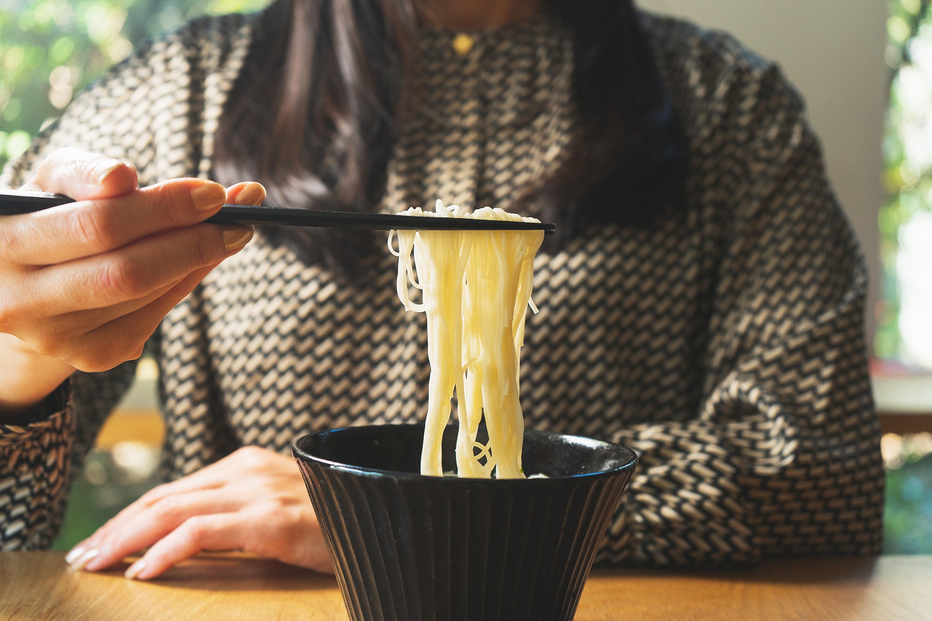 熟成と撚っては延ばす工程を繰り返すことで、小麦粉に含まれるグルテンがデンプン粉を一定方向へ延びて形成されます。包み込むように。それが滑らかな食感とコシを表現し、つるつるののど越しを生み出します。