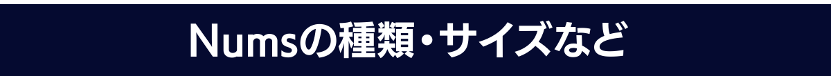 Numsのサイズと種類は以下の通り商品名:Nums(ナムス)素材:アルミノシリケートミネラルガラス