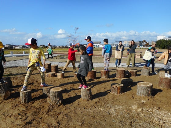 こども公園部長とパパたちで作った切り株遊具。