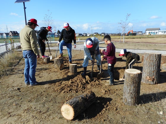 こども公園部長とパパたちが協力して、公園に切り株遊具を作りました!パパたちの力で、楽しい飛び石遊具が出来上がりました!