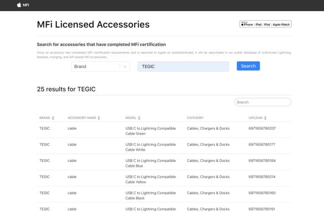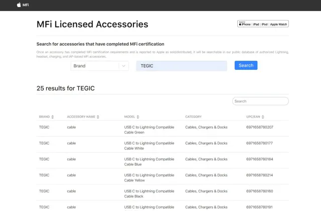 MFi Licensee App (apple.com) こちらから検索していただけます。