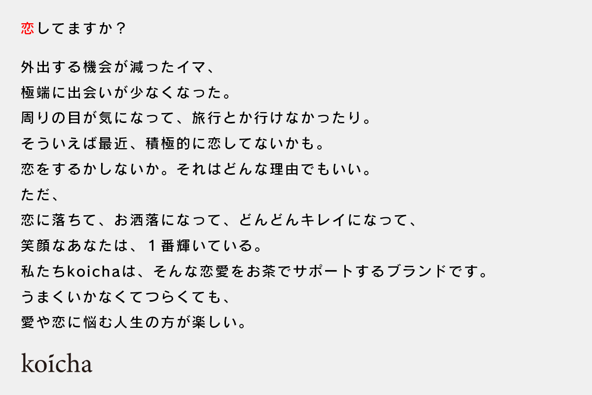 そんな"恋"に、普段何となく飲んでいる"お茶"を掛け合わせたのが「koicha」です。