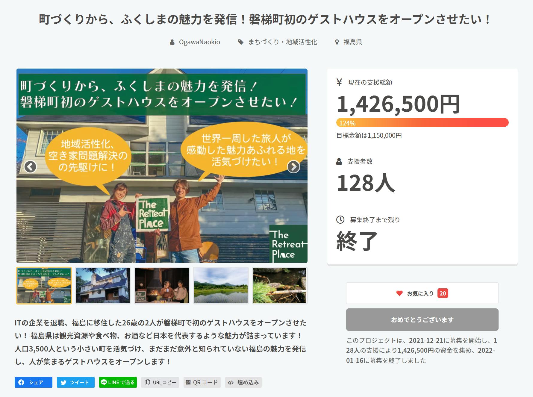2022/01/21 10:081月16日23:59をもって、『町づくりから、ふくしまの魅力を発信!磐梯町初のゲストハウスをオープンさせたい!』のプロジェクトが終了しました!早速、リターン発送に向けた準備なども進めており、バタバタしており報告にお時間がかかってしまいました。まずは、クラウドファンディングご支援結果について報告させていただきます。=======クラウドファンディングご支援結果======= ご支援者数:128人ご支援総額:1,426,500円ご支援達成率:124%======= ======= ======= ========振り返ってみると、本当に多くの方に支えられこのプロジェクトを実施することができました。改めてとなりますが、ご支援いただいた皆様、支援の和を広げ拡散いただいた方々、本当にありがとうございました!共同代表の小川&須田心より御礼申し上げます。本来ならばご支援いただいた方、一名一名にしっかりとお礼をお伝えさせていただくべきかとは存じますが、多くの方が宿泊券をご支援いただいたこともありますので、お越しいただいた際にも直接お伝えさせていただければと思います。また、宿泊券以外のリターンをご支援いただいた方にもリターン発送の際改めて、お伝えさせていただきます。さて、今後のリターン発送のスケジュールですが、現在準備を進めており、別途お客様のご予約などによりスケジュール変動する可能性がありますが、以下を想定しております。====================1月中 リターン送付物の準備2月~ リターン発送====================ありがたいことに想定よりはるかに多くの方にご支援いただき、発送準備にお時間を頂戴いたしますが、ご了承いただけると幸いです。また、もし早めに使いたい!という方がおりましたらおっしゃっていただければ対応させていただきます。連日積雪が30cm積もったりと、今年はとてもいい雪と言われています!ご宿泊のみとはいわず、是非ウィンタースポーツをする方は一緒に滑ったり、夜は宿で色々お話ししたり、楽しい時間をご一緒できればと思います!以下SNSより最新情報など発信しておりますので、是非フォローいただけると嬉しいです!============================================Instagram:https://www.instagram.com/theretreatplace/?hl=jaFacebook:https://www.facebook.com/theretreatplace.Bandaimachi============================================最後になりますが、厳しい冬が続いておりますので、どうぞお体に気をつけてお過ごしください。皆様にお会いできること、心より楽しみにしております! もっと見る