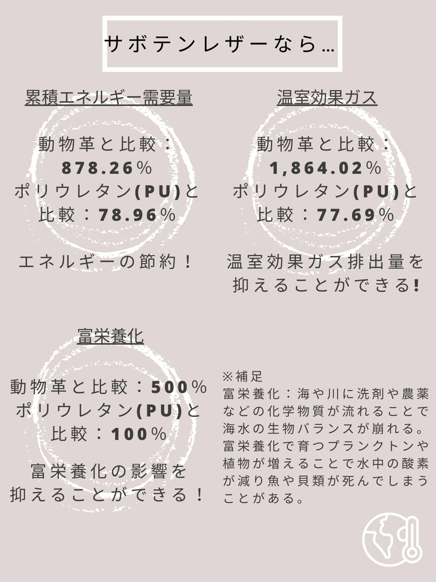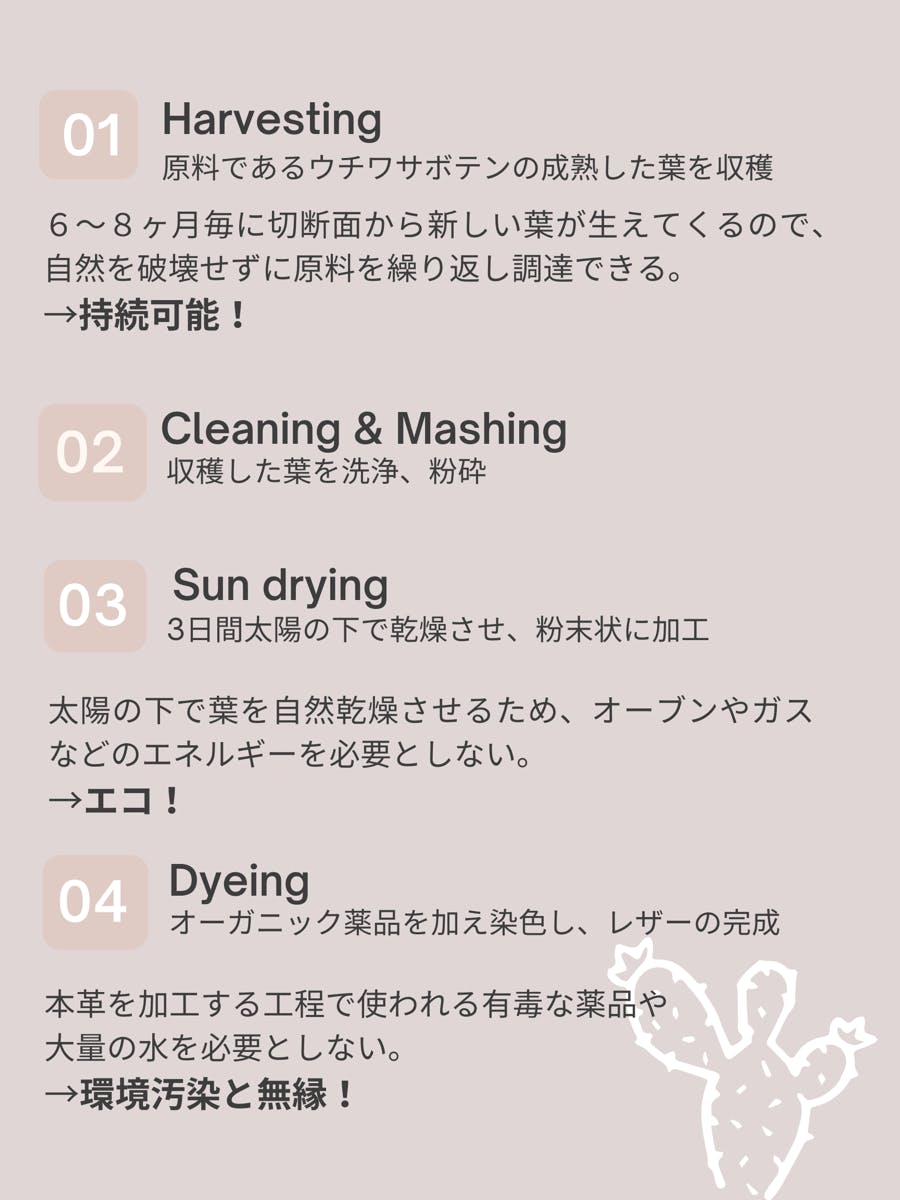 人口的なエネルギーを使わず、サボテンの成長過程でも水をほとんど使用しないため、本革と比べて、1,864.02%の温室効果ガスを削減、また164,650%の水の量を削減できるといわれています。