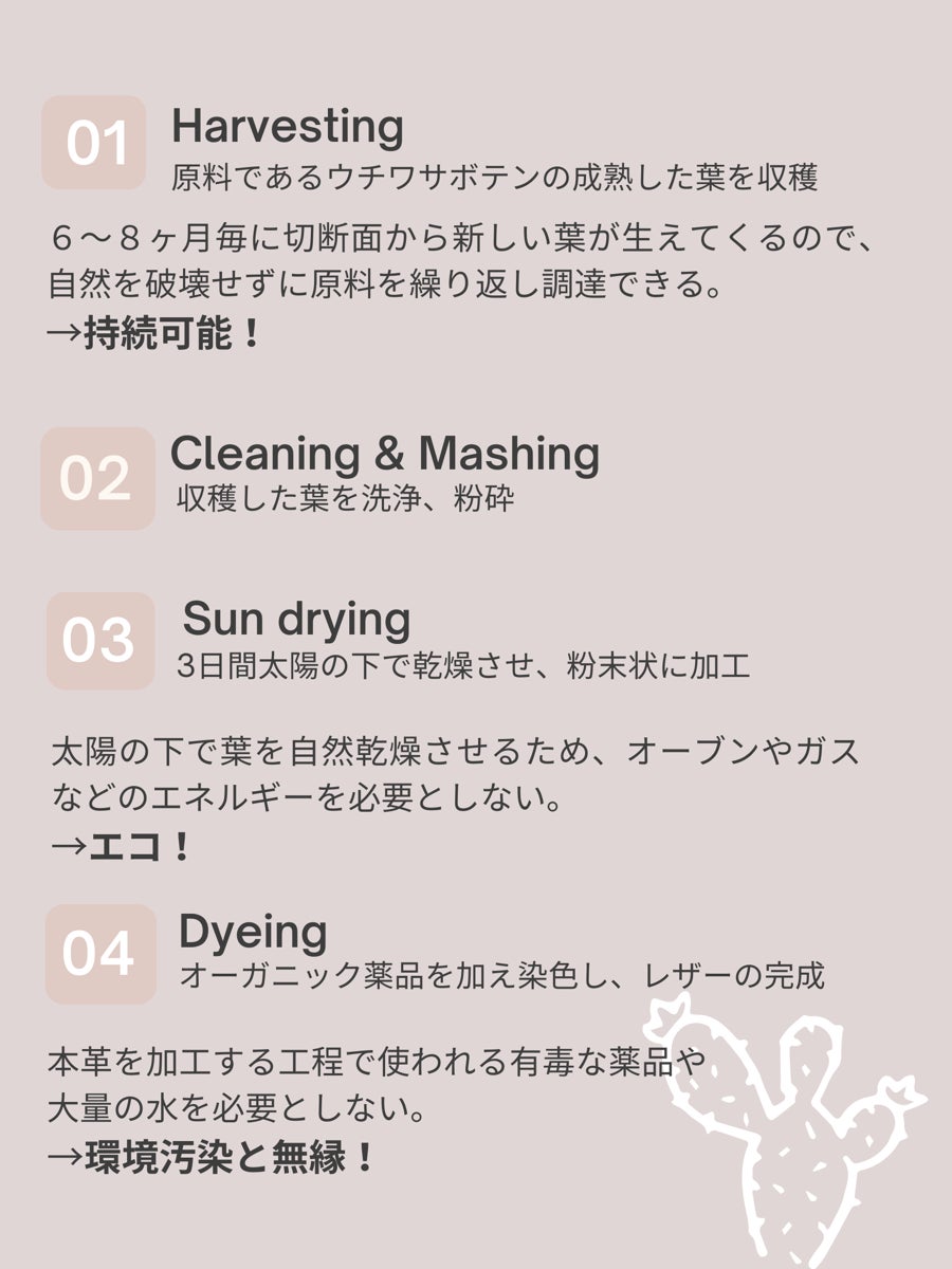 人口的なエネルギーを使わず、サボテンの成長過程でも水をほとんど使用しないため、本革と比べて、1,864.02%の温室効果ガスを削減、また164,650%の水の量を削減できるといわれています。