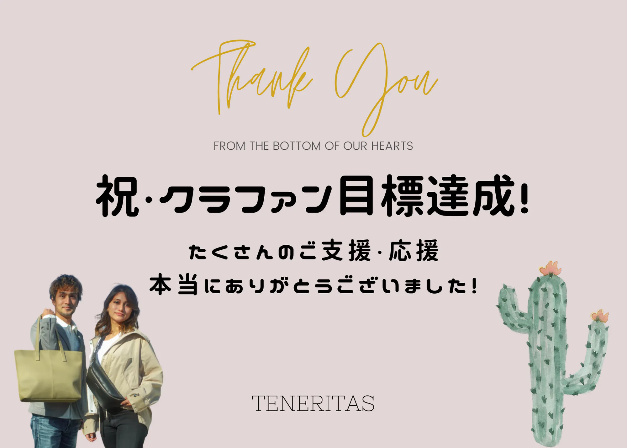 2022/01/15 18:00日頃からTENERITASを応援してくださっている皆さま、いつもありがとうございます。今回のクラファンで初めてTENERITASを知ってくださった方も、本当にありがとうございます。いただいたコメント、全てメンバー全員で読ませていただいております。早いもので残すところあと1日となりました。約30%オフ、最大15,000円引きの各種セット割、約15%オフ、最大4000円引きで手に入る早割は、泣いても笑っても明日までです! サボテンレザーという新しい素材で皆さまと一緒に動物や地球、人に少しでも配慮された選択を広めたい!長く愛用していただけなければサスティナブルではありませんので、飽きにくいシンプルなデザインと日本の職人さんの手作りというクオリティーを担保しております。現在204%です。本当にご支援いただきありがとうございます。実は、今回のクラファンの目標が「収益を得ること」ではありませんので、250%達成しても赤字です。笑利益度外視で今回はめちゃくちゃ頑張りました。最後の最後まで諦めず、動物や地球環境の現状について考えてもらうきっかけになりたいです!もっともっとたくさんの人に、優しい選択肢があるということを広めたい!残り1日で250%まで達成したいです!!皆さま、ぜひ最後の拡散をよろしくお願いいたします!!また、TENERITAS公式のインスタグラムやツイッターを覗いていただくとメンバーのアカウントもありますので、私たちの意気込みや想い、熱量をチラ見していただけます。ぜひチェックしてみてください。 もっと見る