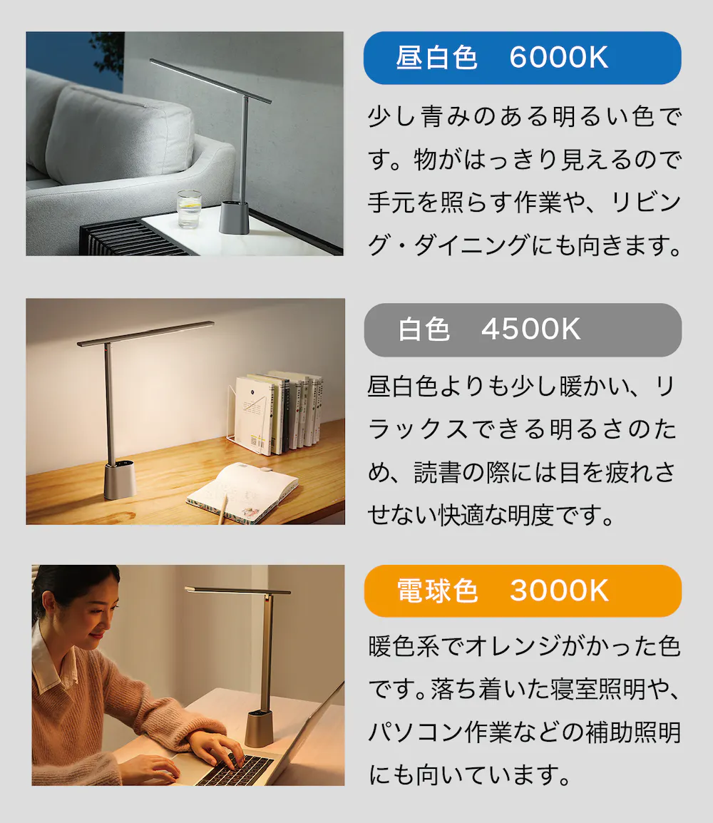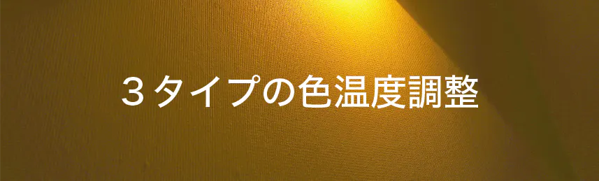 色温度とは光源が発する光の色を表すための尺度で、単位はケルビン(K)で表します。同じ白でも、青みがかってクールな印象の「昼白色」から、赤みがかって温かみのある「電球色」まで微妙な色味の違いがあり、照明に使ったときに雰囲気が大きく異なります。【Lumiera】は明るさに応じて3タイプの快適な色温度でお部屋を照らします。