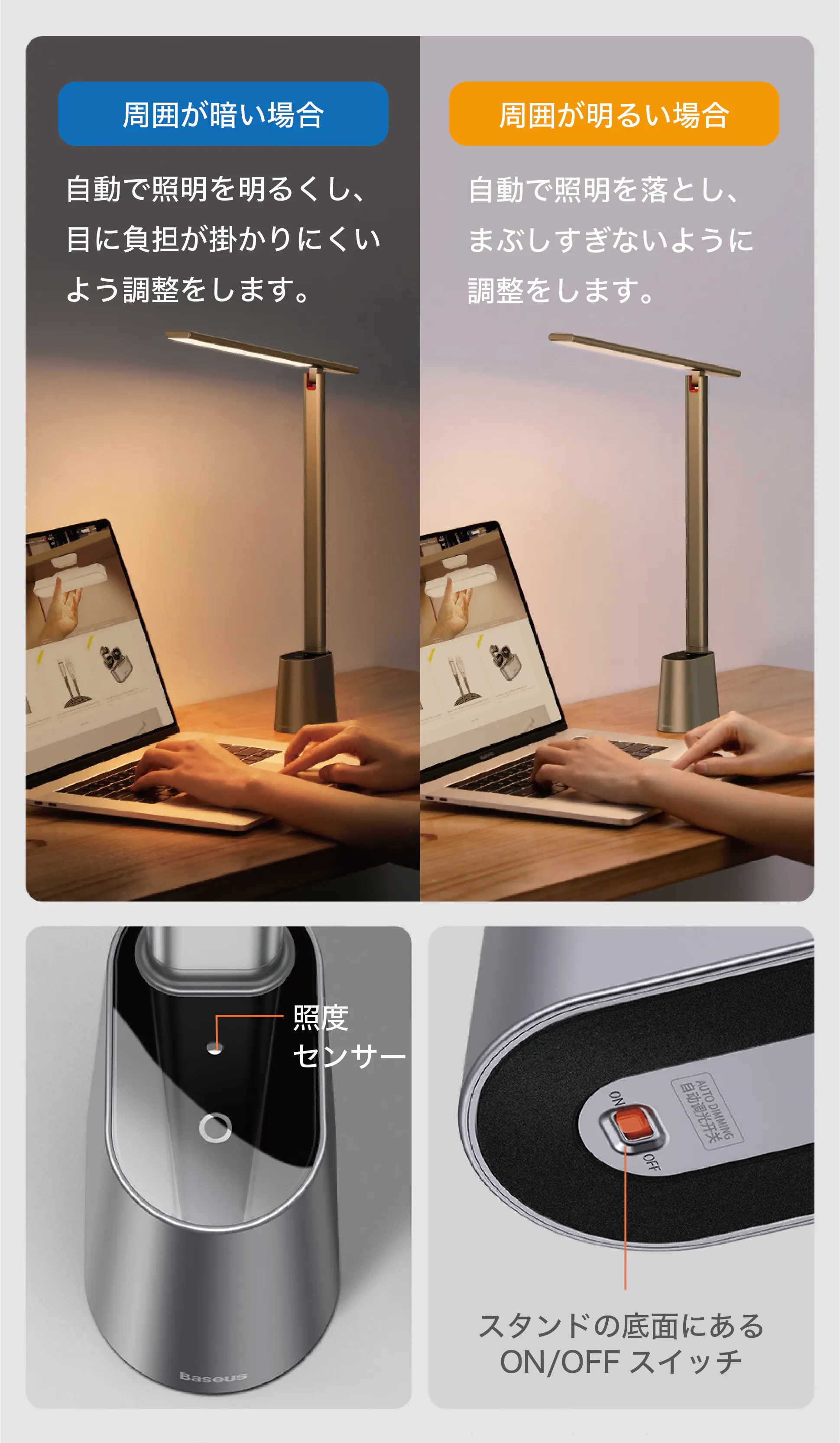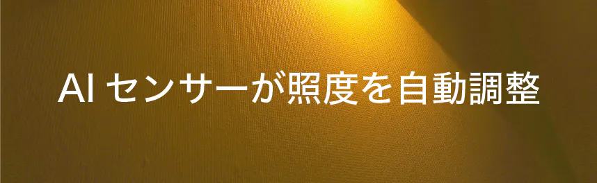 内蔵のAIセンサーが周囲の明るさを検知し、ライトを「ちょうど良い明るさ」に自動調整します。あなたに代わって利用シーンに合った心地よい明るさや色を見つけてくれますので、その都度照度を調整をする必要がありません。