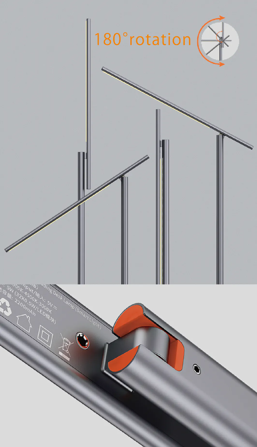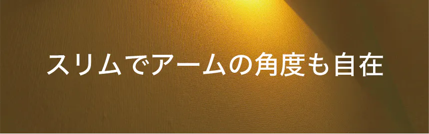 【Lumiera】はミニマルでスリムなデザイン。素材はアルミ合金なので丈夫で色あせません。アームは180°回転し、縦に折りたたむことも可能。使用するシーンによって、お好みの照明方向と照明範囲を自由に調節できます。