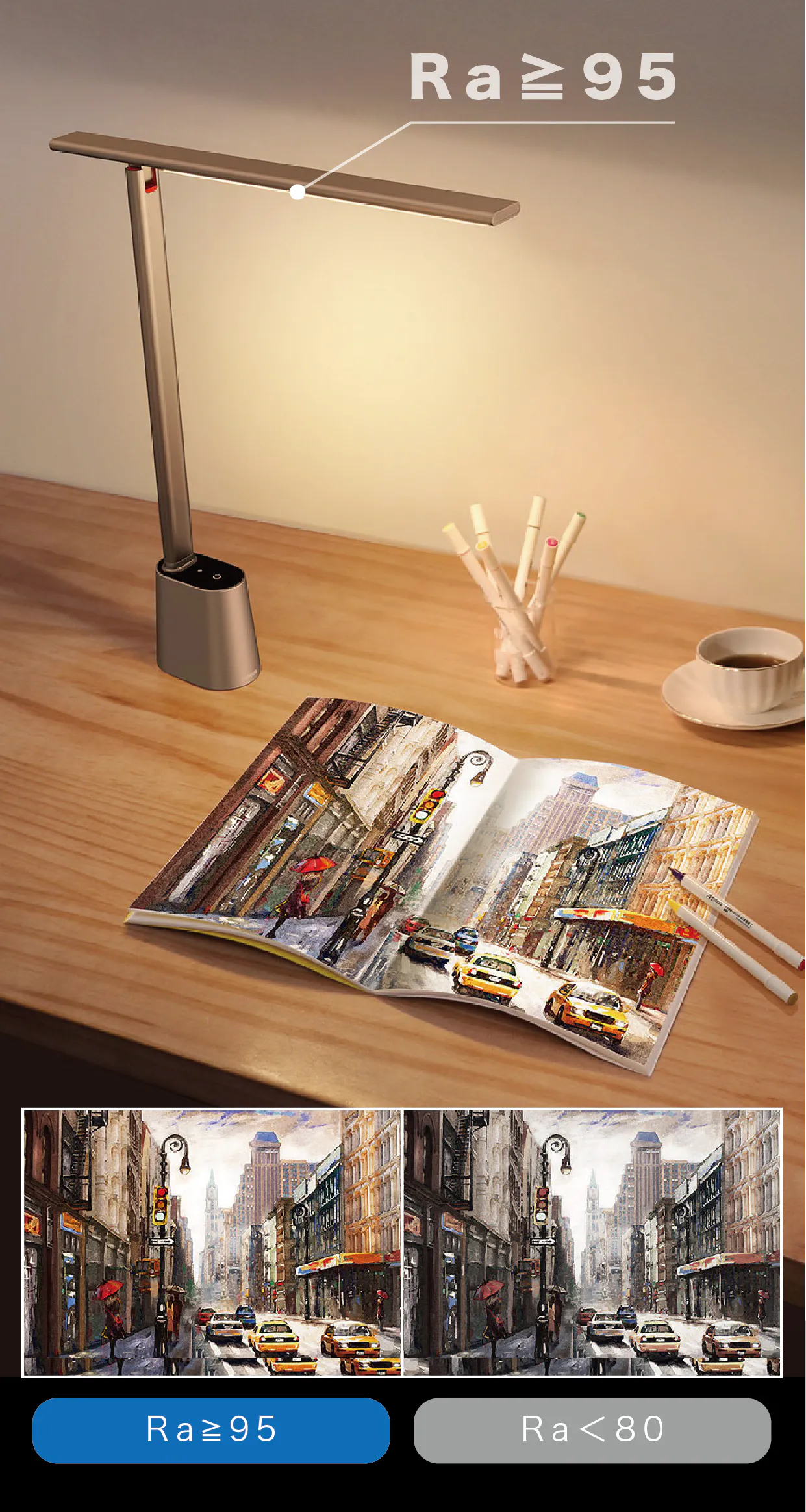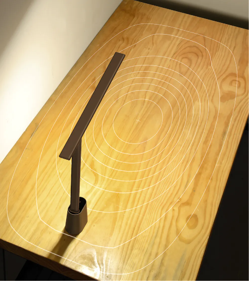 500ルクスの明るさのランプは、大きな長方形エリアでデスクトップを均等に照らします。明るさが集中しない快適な光で目を優しく保護します。