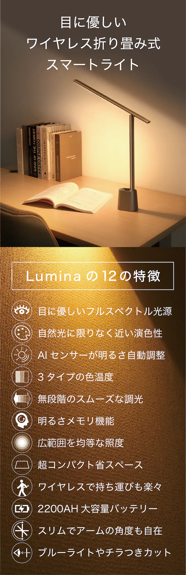 【Lumiera】はスリム・軽量なので、必要な場所への持ち運びも楽々。目に優しいあかりで、あなたの「おうち生活」をもっと快適にします。