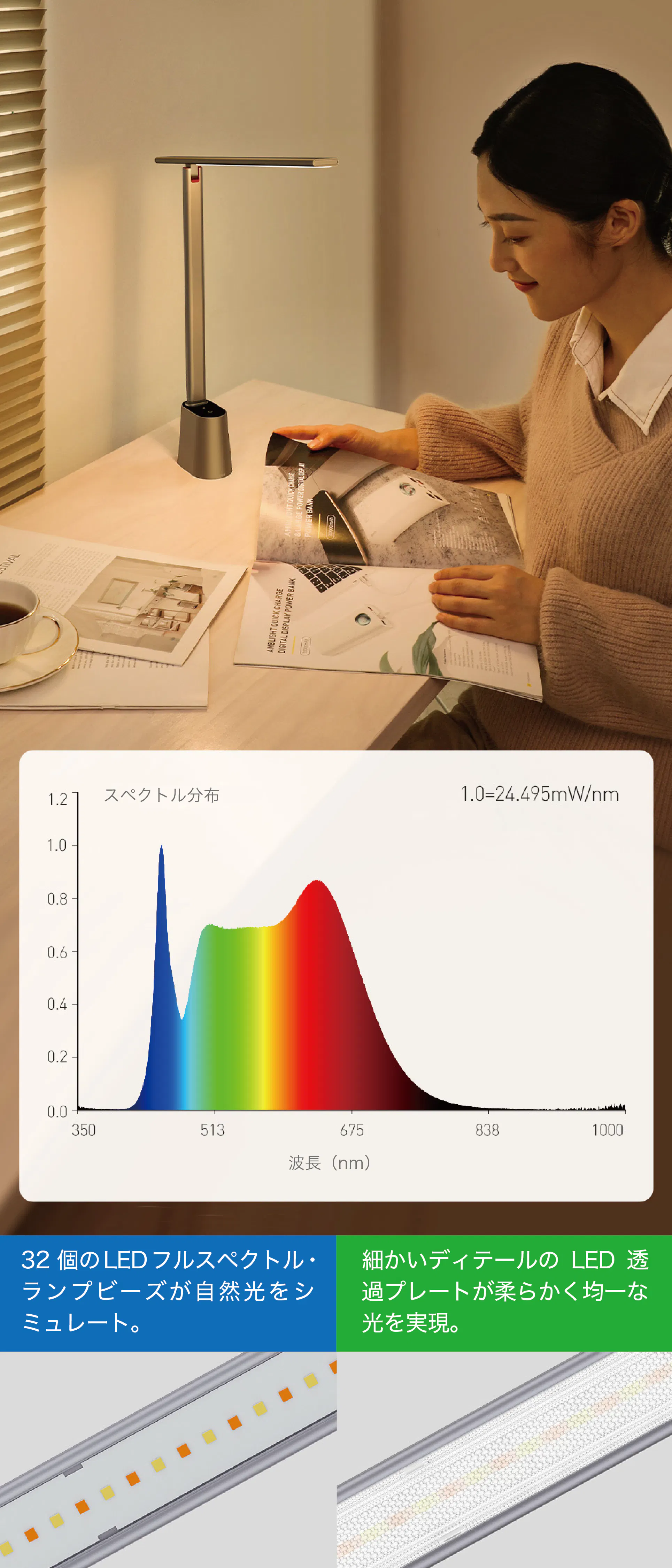 太陽光は、紫から赤まで連続するすべての「色光」を持っているので「フルスペクトル光」と呼ばれています。【Lumiera】は太陽光に極限的に近づくように設計されたLEDフルスペクトルランプです。柔らかな光で物がくっきりと良く見え、その上まぶしさが少なく眼に優しい光が、心地よい照明環境を作ります。