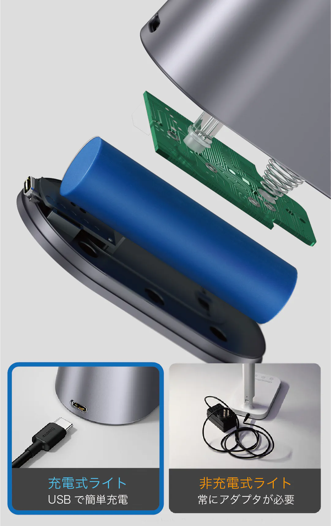【Lumiera】はUSB Type-Cポートで充電できるのでアダプターは不要。かつ極めて省エネで、消費電力は僅か5Wです。そして2200mAhの大容量バッテリーを備えていますので、ハイライトで3時間、ローライトで13時間以上の連続照明が可能です。