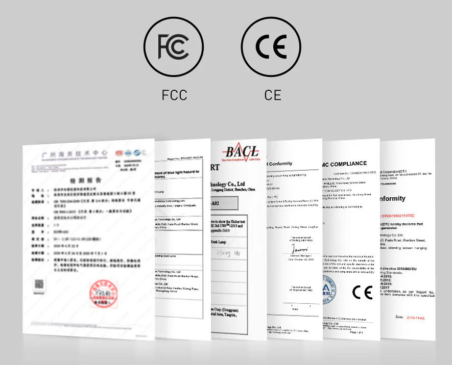 デスクライトは毎日使うことが多いため、チラつきやブルーライトが強いと目眩や頭痛、視力低下を引き起こす危険性があります。【Lumiera】はEU加盟国の安全基準を満たすCE認証およびアメリカ合衆国の安全基準を満たすFCC認証を取得し、ブルーライトやチラつきをカットした優しい光で、あなたの目をやさしく守ります。