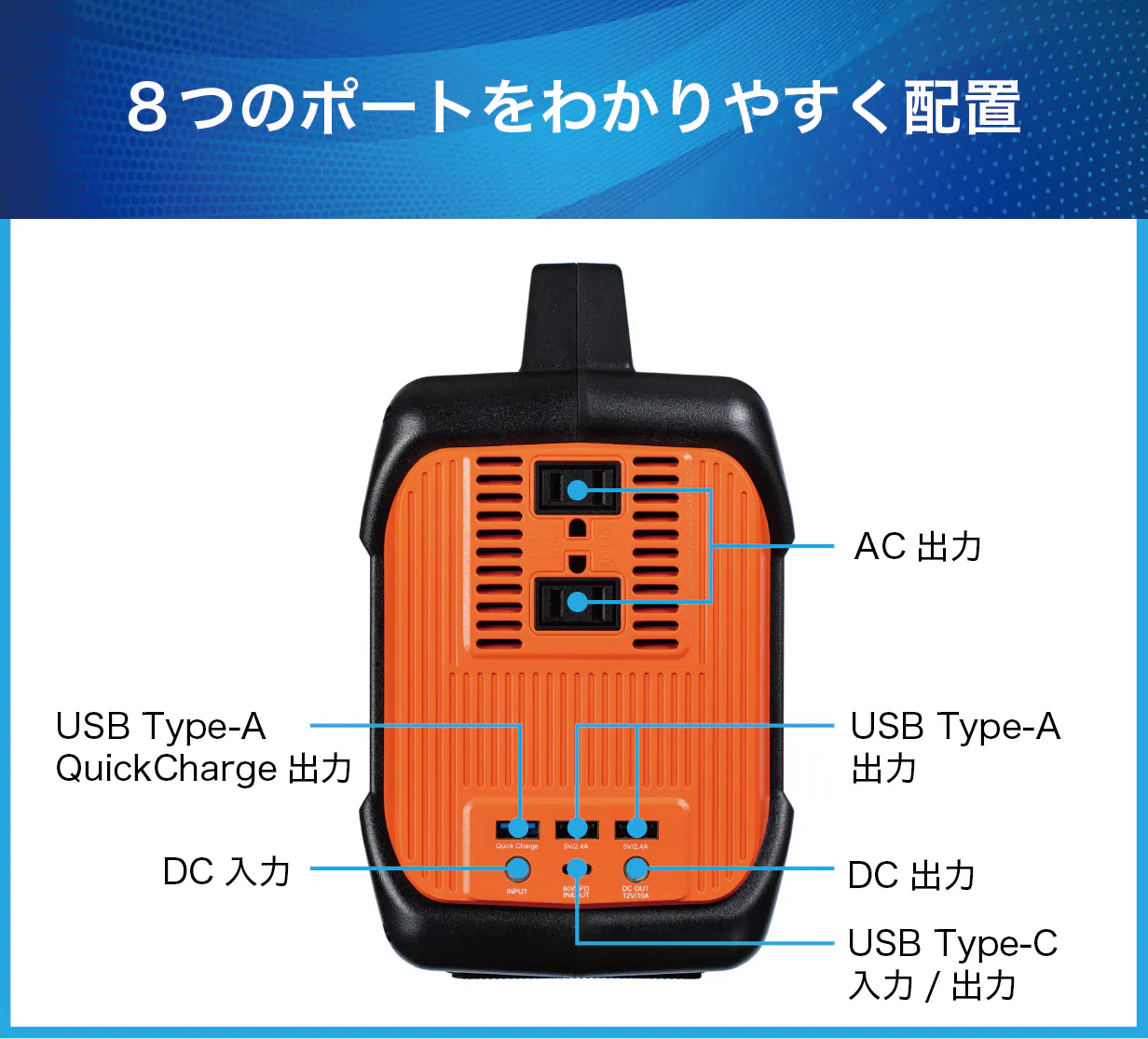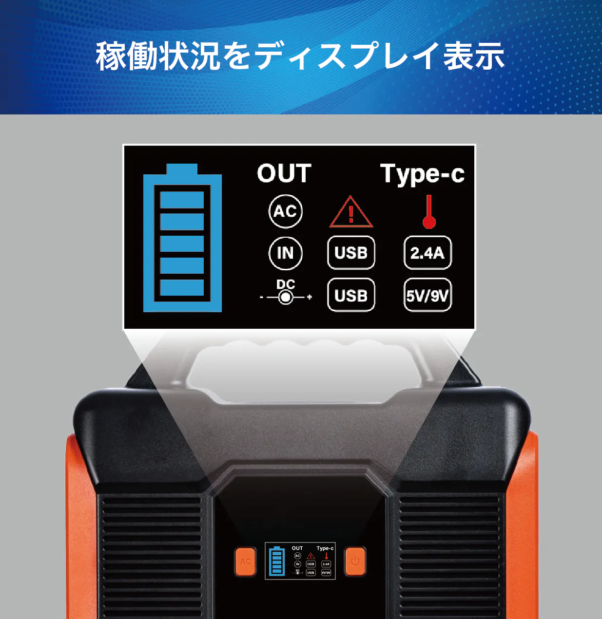センターにある液晶ディスプレイでは電池残量、各ポートの入出力状態などがわかります。また、万一内部温度が上昇したり過負荷などが生じたときにはランプが点灯します。