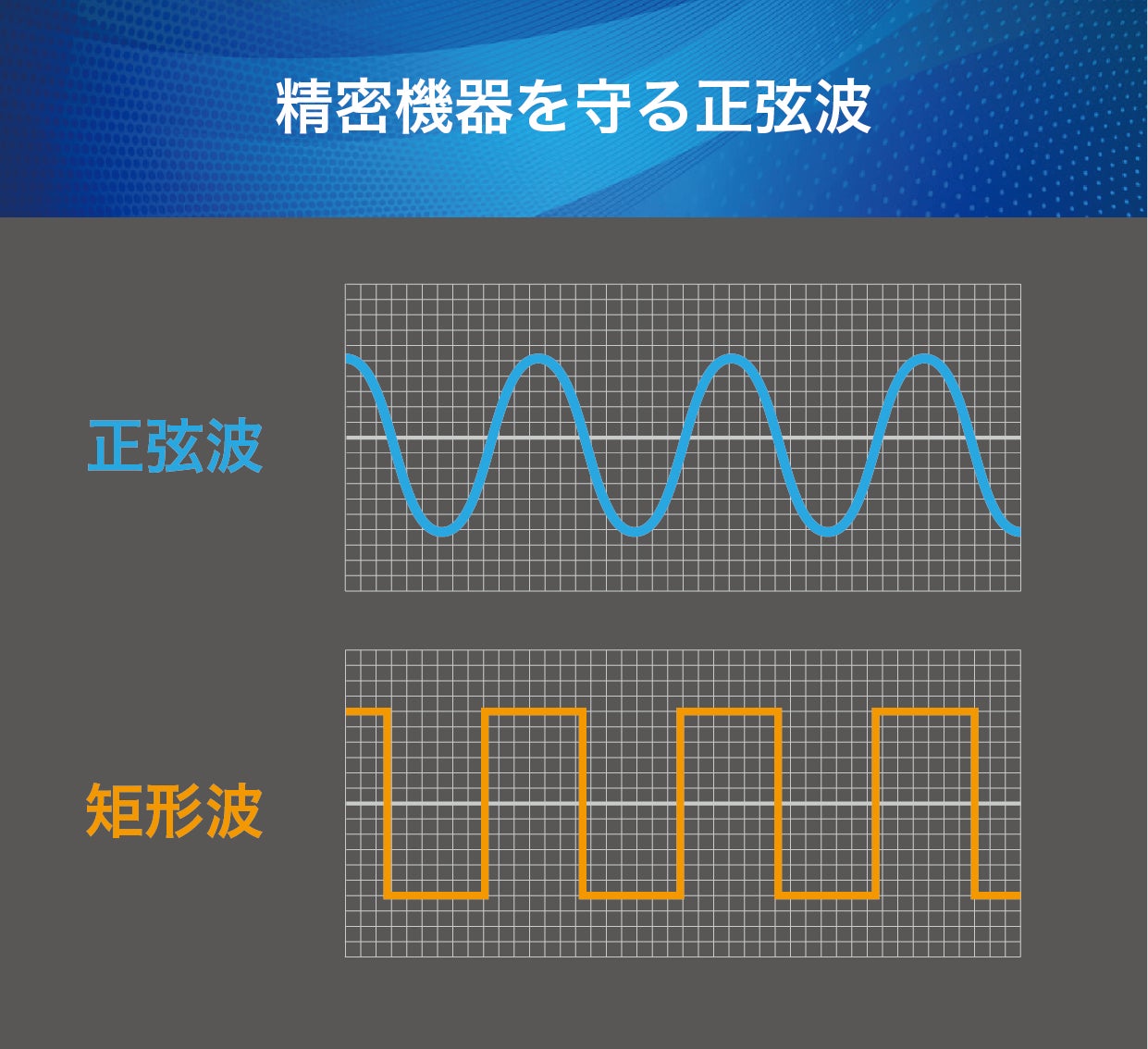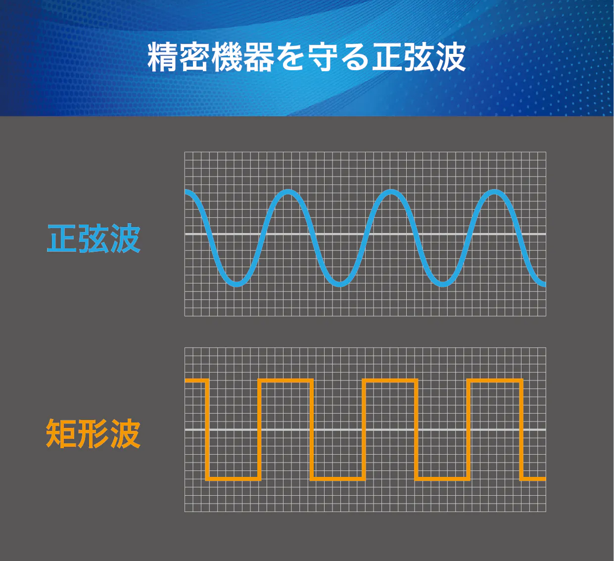 ポータブル電源の出力には正弦波(せいげんは)と矩形波(くけいは)という2種類の波形が存在します。手頃な値段のポータブル電源によく見られるのが「矩形波」ですが、ほとんどの家電製品や電子機器は「正弦波」を前提に設計されていますので、「矩形波」の出力を使うと故障の原因となります。【Minivo】は家庭用100Vコンセントと同じ波形の「正弦波」を採用していますので、ノートパソコンやタブレット端末などの精密機器にも安心してご利用いただけます。