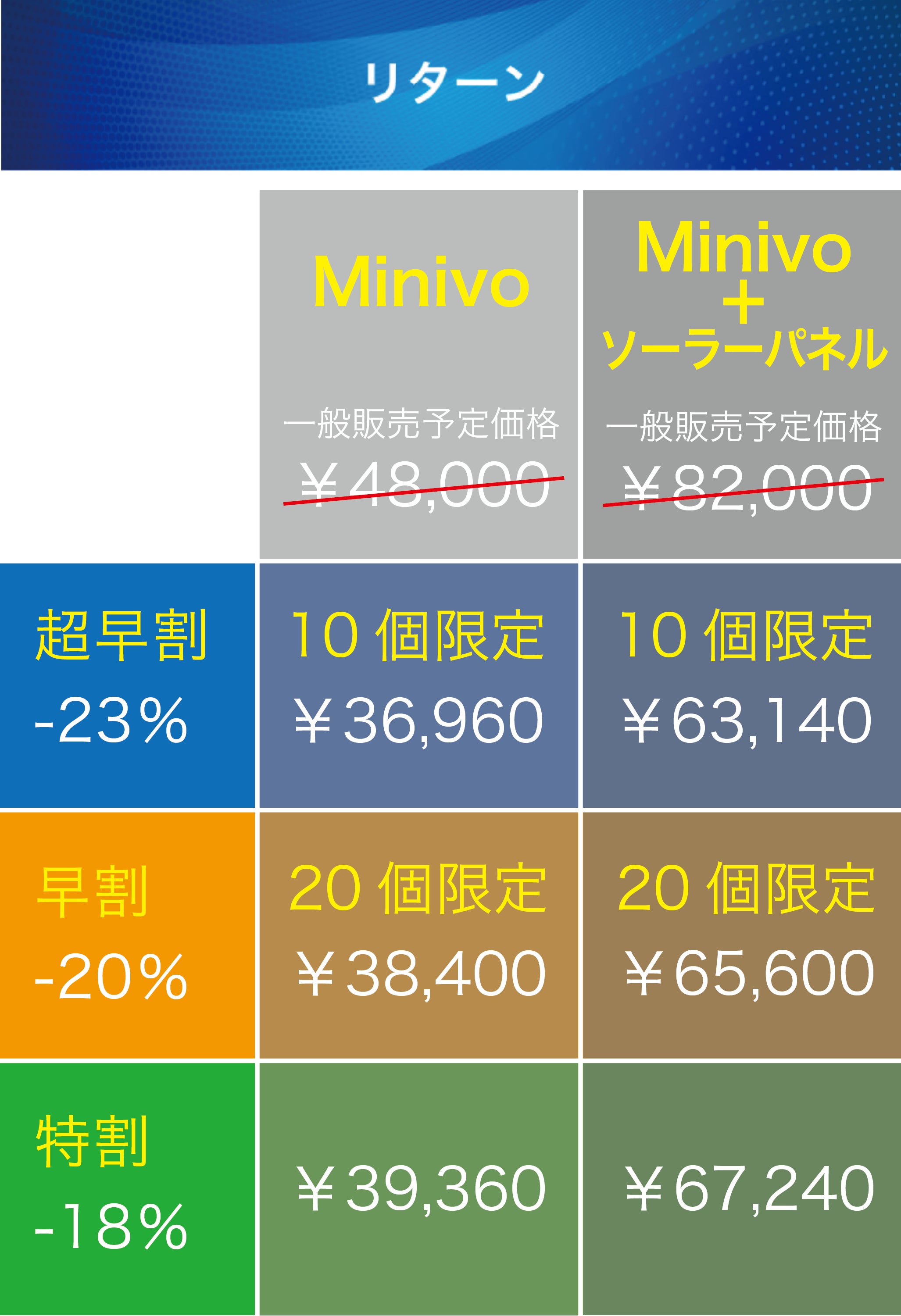 さらにソーラーパネルを活用すれば、停電が長期間続いた場合でも【Minivo】を充電し続けられるので安心です。