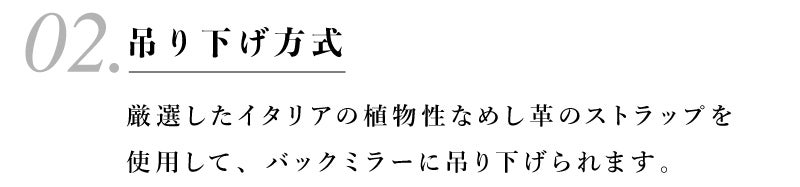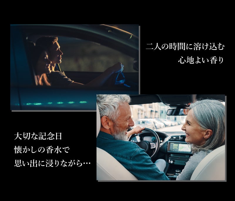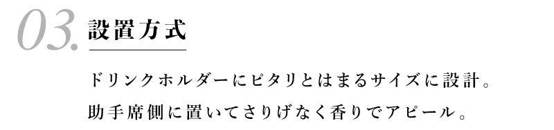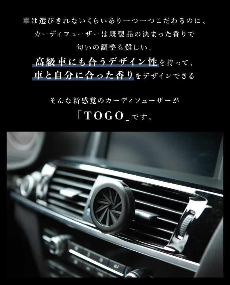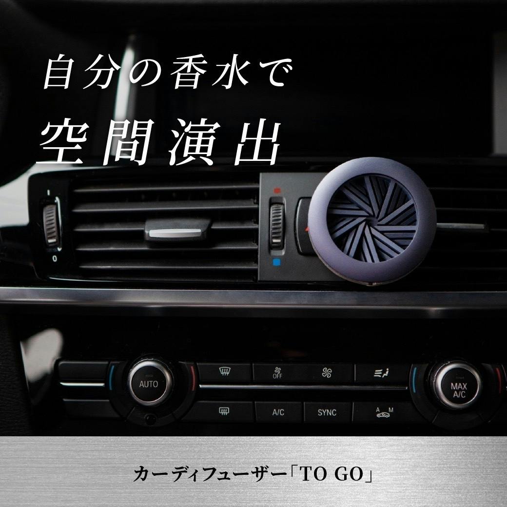 「TO GO」だと塗布量での調整は勿論、淡く香らせたい時はドアポケットに、強く香らせたい時はエアコンルーバーやバックミラーに吊り下げる事で最高のドライブデート空間を演出できます。