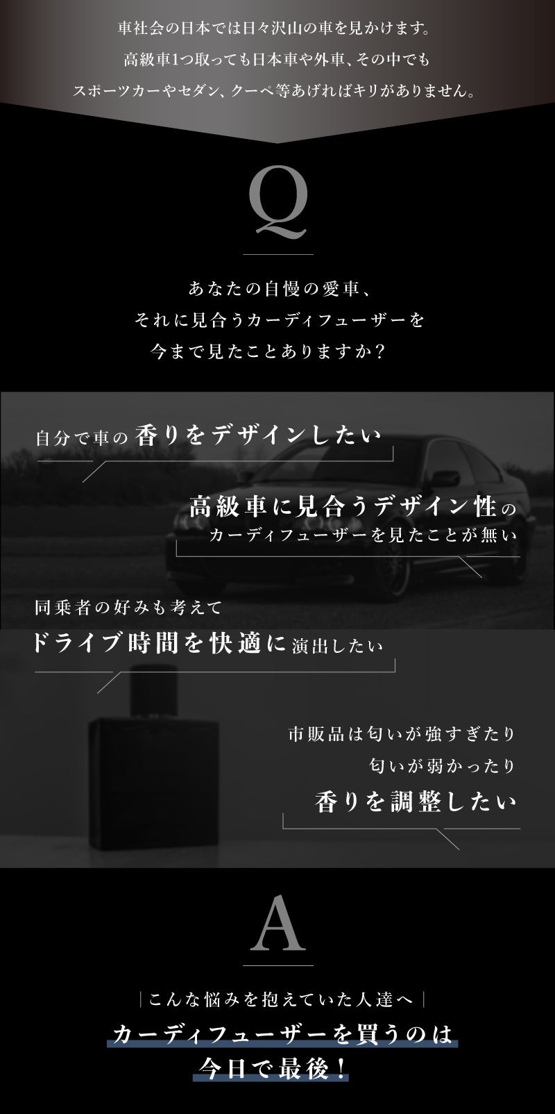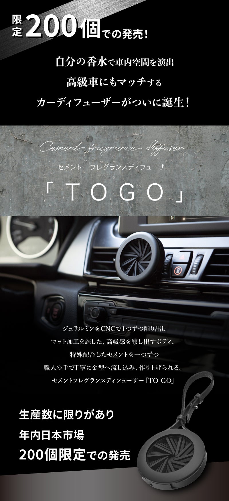 いくつものプロ集団が1つ1つ手加工している為、限定200個という制約はありますが、日本の車好きの方、高級カーディフューザーを探していた方の手に届く事を嬉しく思っています。
