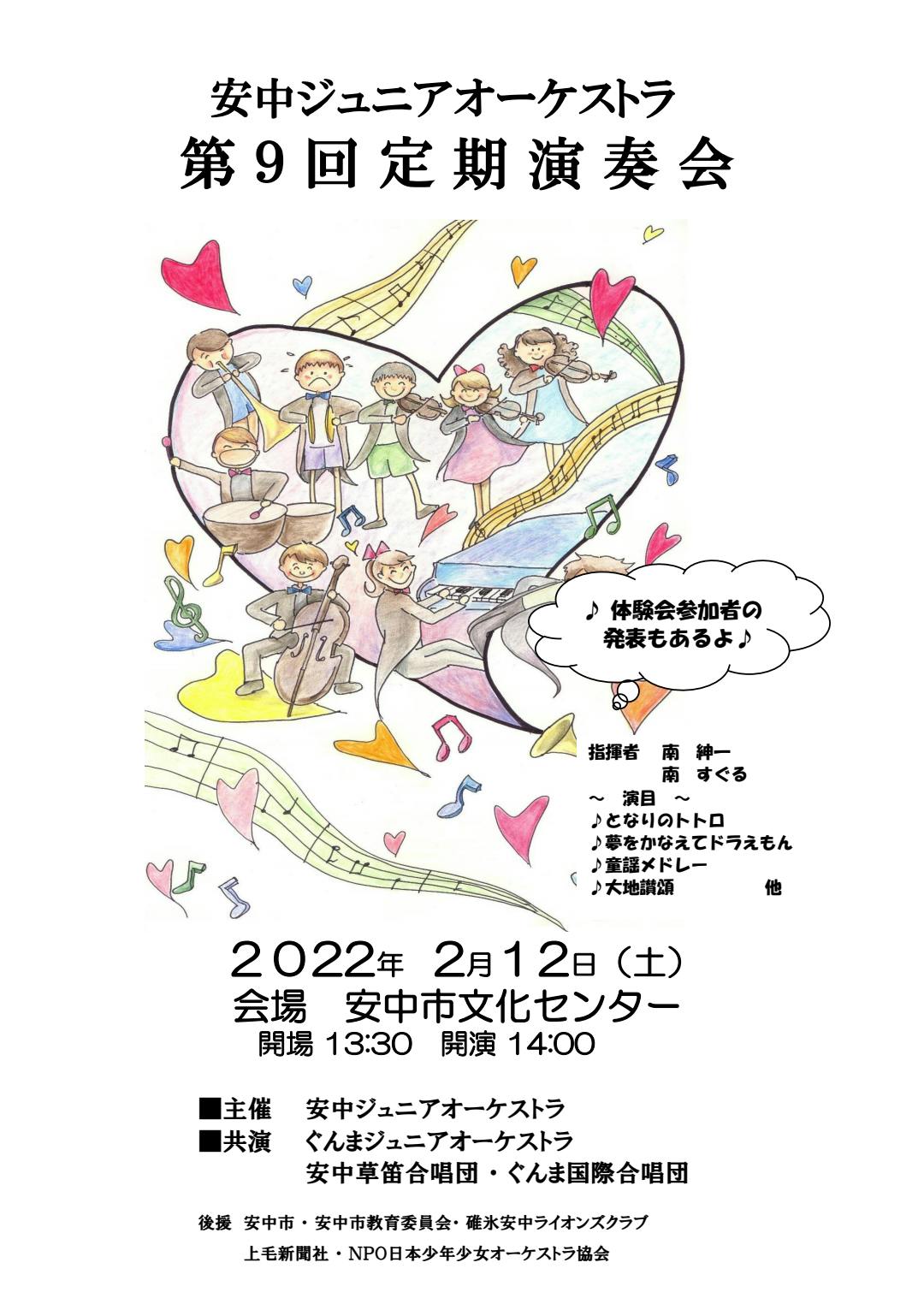 今年度はコロナ禍による自粛期間があり活動を停止せざるを得ない期間もありましたが、ようやく秋に練習を再開し、演奏会に向けて全力で動き始めています。音楽を通じ、仲間と向き合い共に成長する安中ジュニアオーケストラは、このページをここまで読んで頂いた皆様をはじめ、地域の皆様、コロナ禍に団員を支えてくれた保護者および関係者の皆さんに団員の元気な演奏を届け、また、卒業していく団員の思い出となる舞台を作り華やかに送り出したいと考えております。 どうぞ、ご支援いただきますよう宜しくお願い致します。