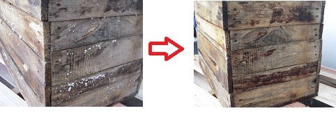 結果、現状の味のあるワイルドな表面と地名・番号等のペイントが入っているものも落とさずそのまま生かし、洗浄・乾燥後釘が出たり割れたりしているものをメンテナンスして、オイルを塗って仕上げただけの方がこの箱の良さが伝わる!
