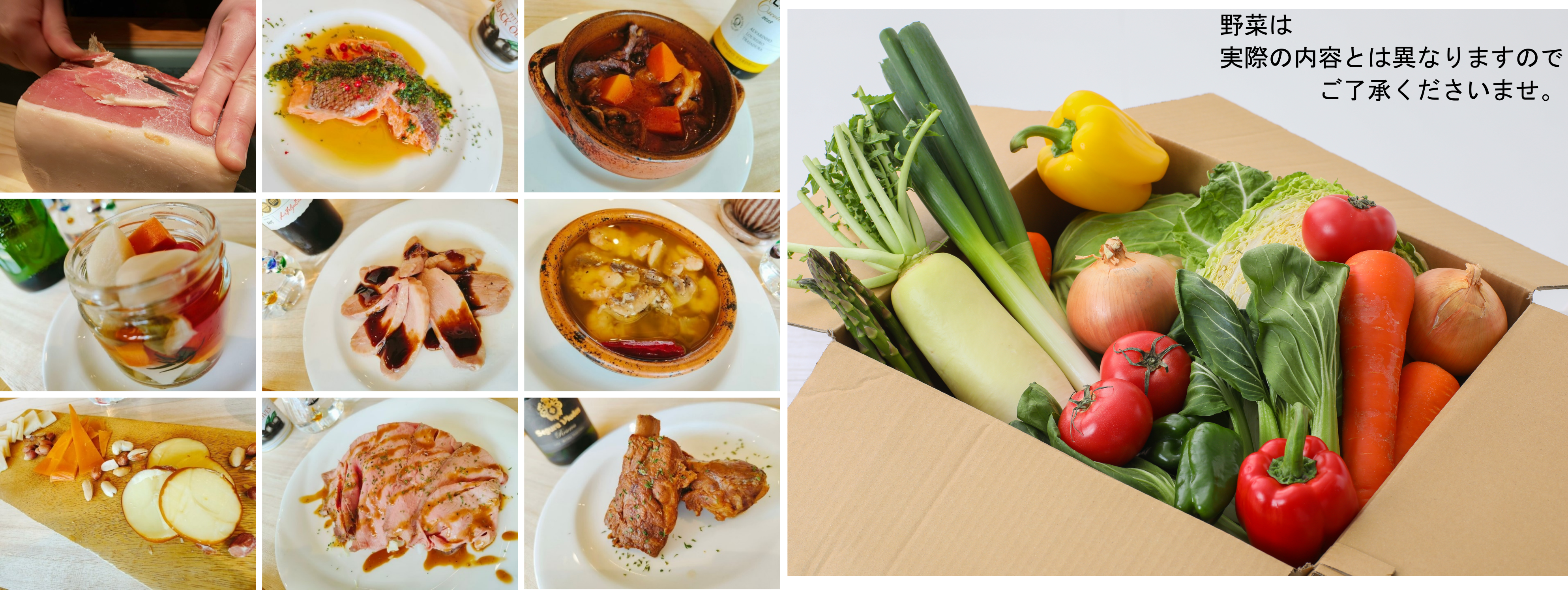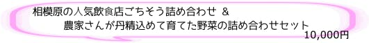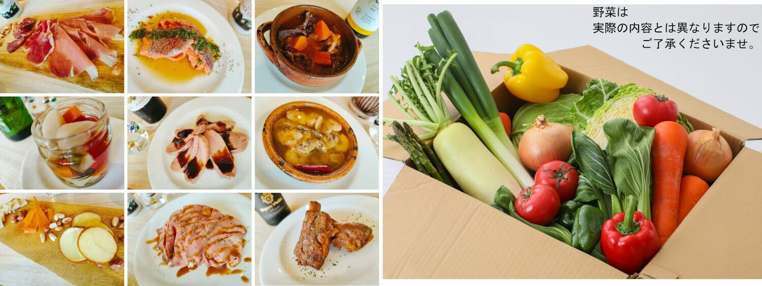 ⼈気飲⾷店ごちそう詰め合わせと、地元の農家さんが愛情たっぷり育てた野菜をセットにしました。
