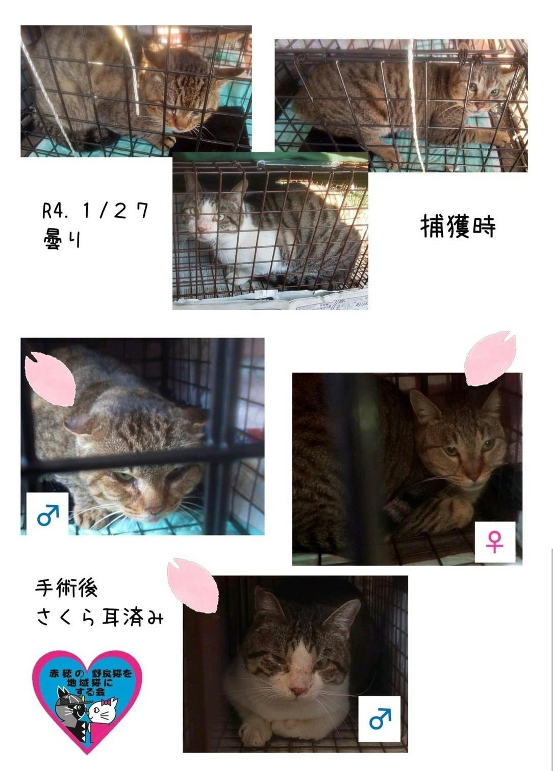 昨日、交通量の多い道の続きTNRを致しました。捕獲器4台を仕掛け3台にオス2匹、メス1匹を捕獲出来ました。3匹の内のオス1匹が重くて体重5キロ越え麻酔は1本で効かず3本打ったそうです。大きかったもんね~!で、風邪を少しひいてたみたいで目薬も差してもらいました。メス猫は捕獲時に暴れて爪を怪我してました。