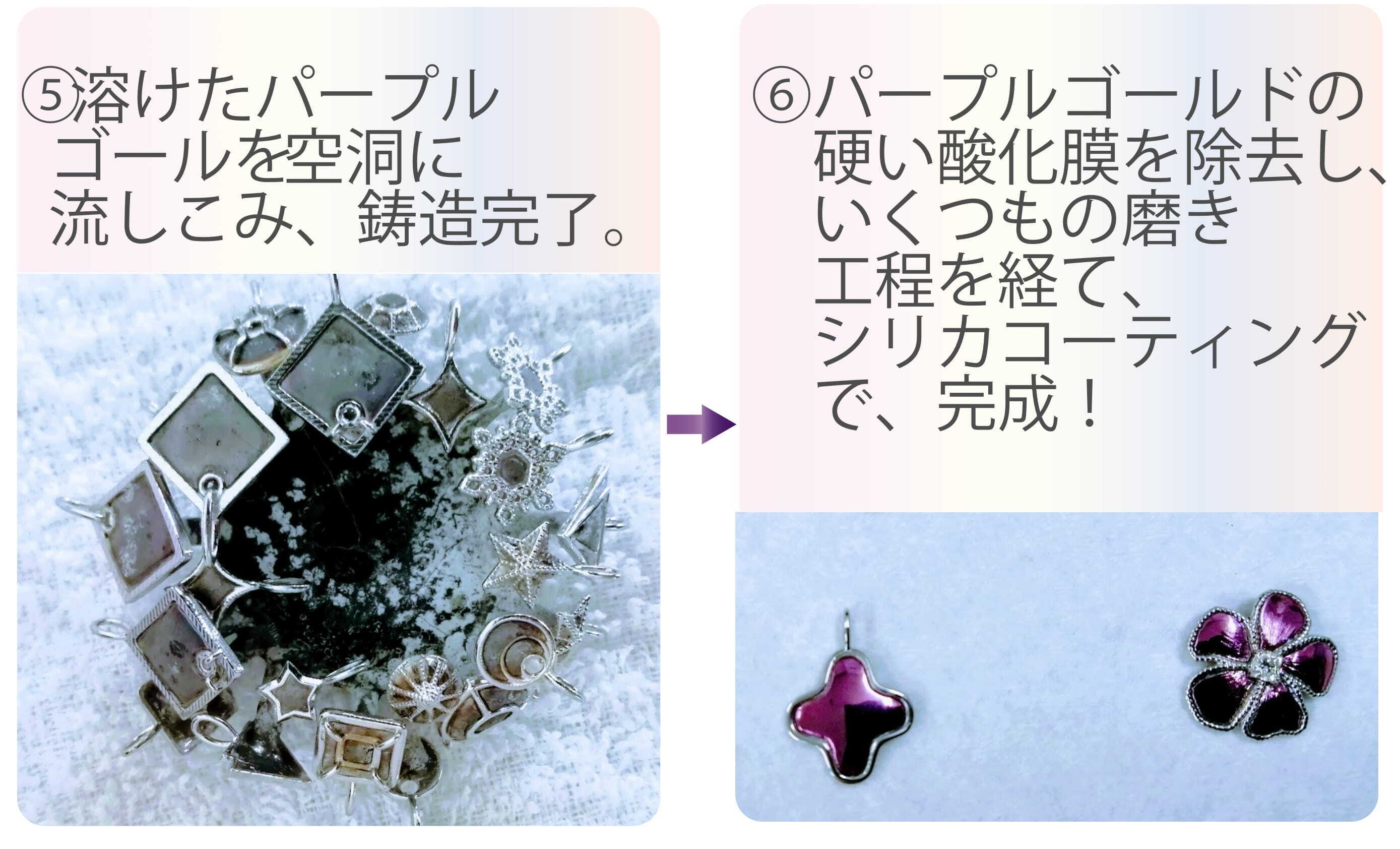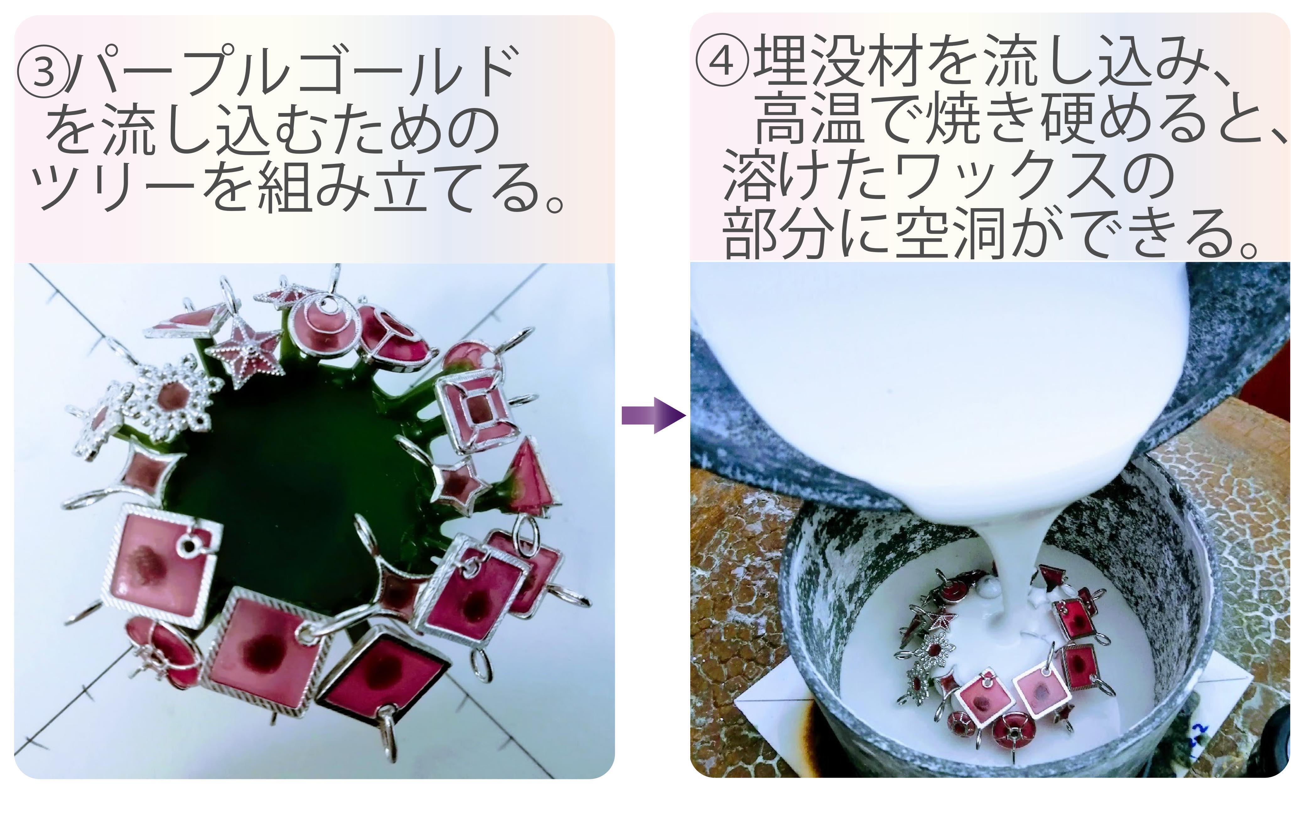 現在ではカケラやジュエリーとして販売できるようになったパープルゴールドですが、開発には弊社会長とアトリエ職人の並々ならぬ熱意と努力がありました。
