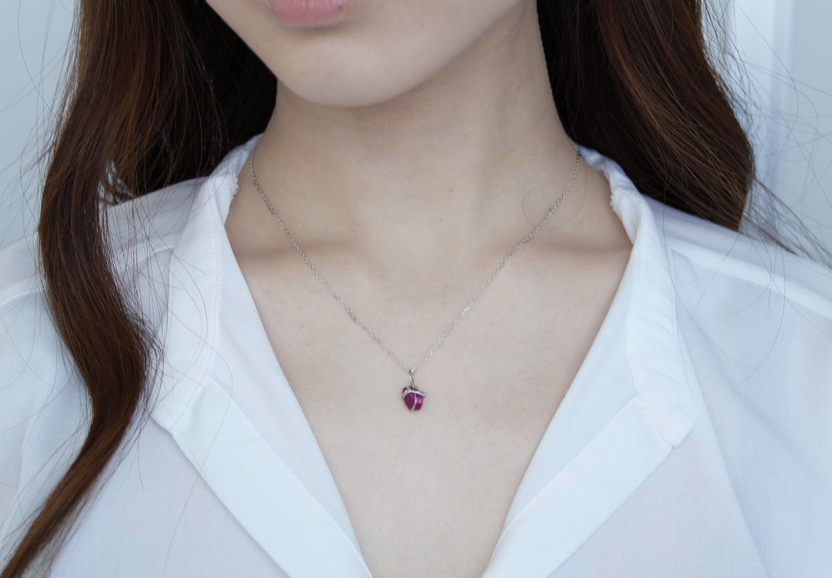 18金のパープルゴールドのカケラを、職人がプラチナ線で手巻き加工してペンダントを製作しました。金属としてのパープルゴールドの表情をお楽しみください。