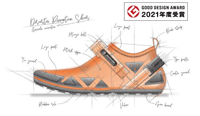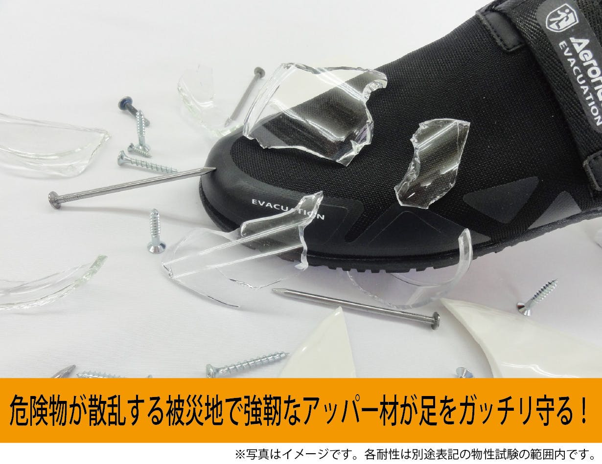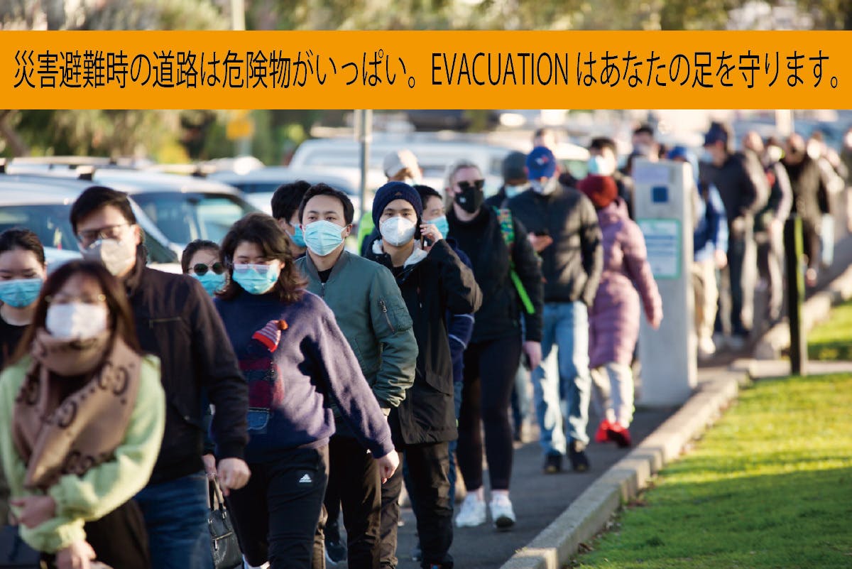 『避難』という意味のEVACUATION(エバキュエーション)は、『すぐそばであなたを守りたい。』というコンセプトで開発したコンパクトな避難用防災シューズです。