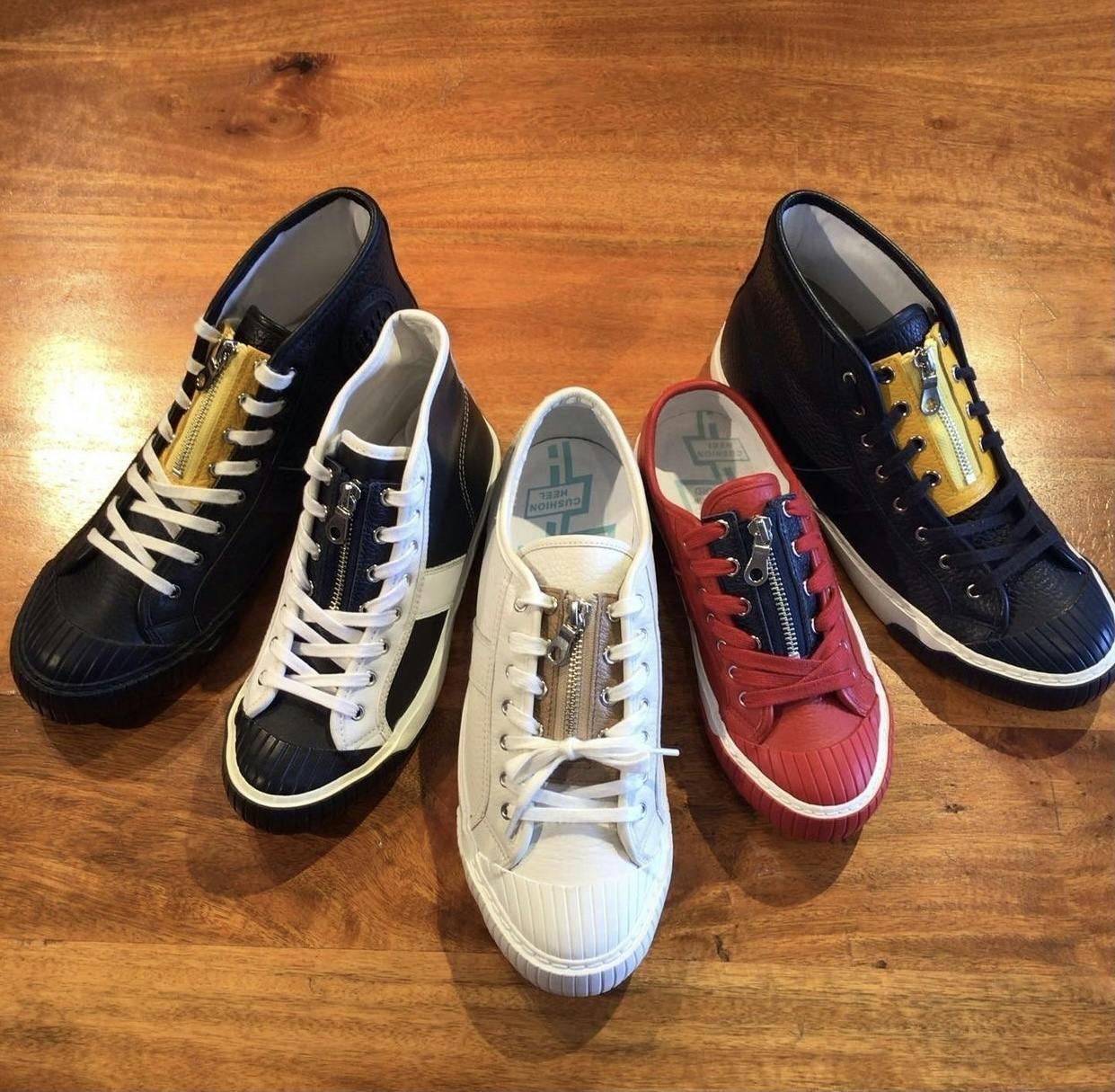 本日、東京浅草の生産工場へ行ってロック機能の付いたYKKファスナーの発注など職人さんと打ち合わせを行って、試作品をスニーカーに装着してみましたので色の組み合わせを御覧下さい。