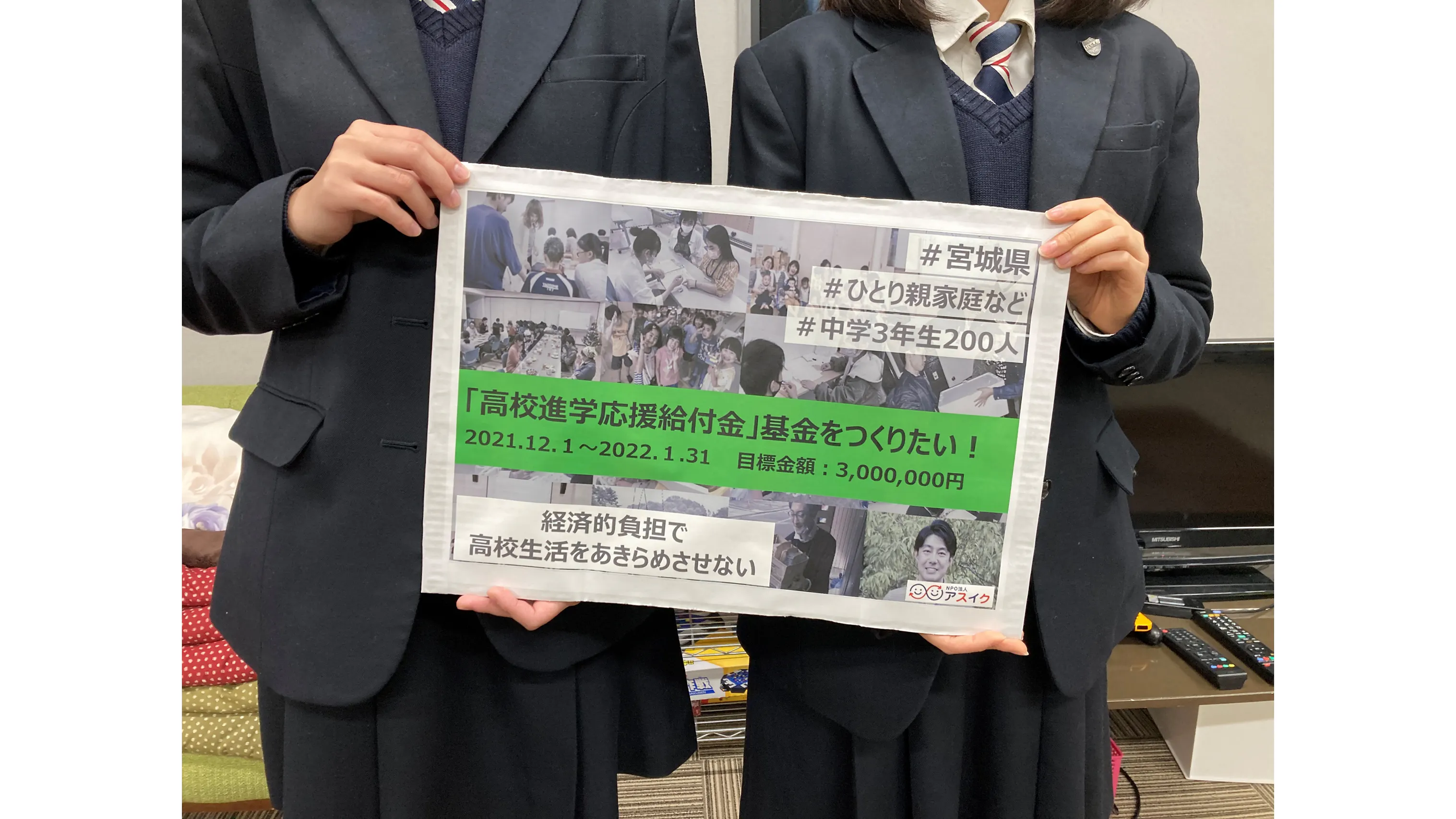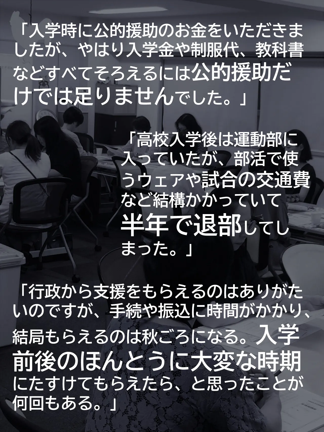 私はこれまでの活動で気づいたことがあります。それは、せっかく勉強をがんばって高校進学を決めても、「高校進学にかかるお金のせいで、新しい生活のスタートにつまづく子どもたちがたくさんいる」ということです。