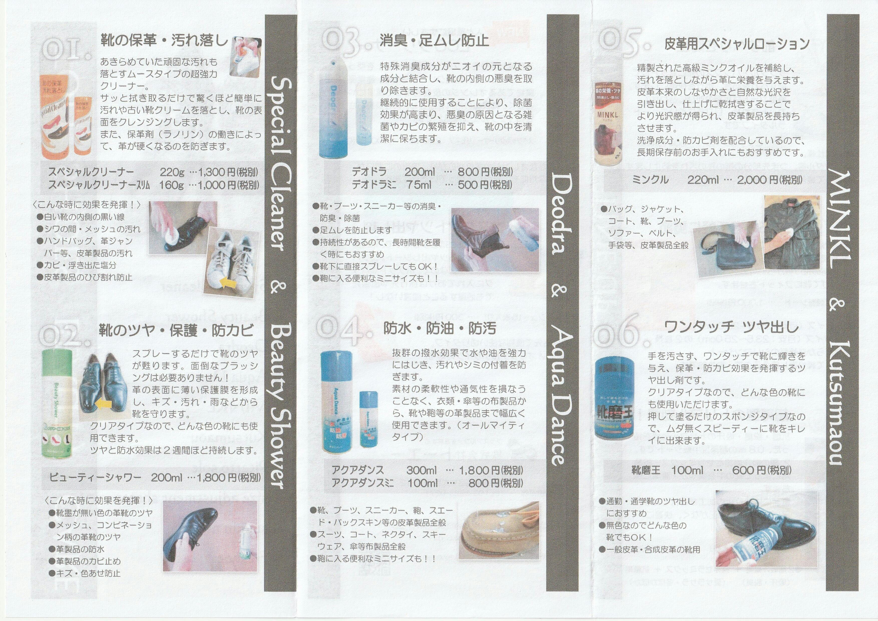 例えばスニーカーのソールの汚れが落ちなくてお悩みの方に新品と間違えるくらいきれいになった(SNSにアップされたお客様の声)とお喜び頂いている泡タイプの『スペシャルクリーナー』や、ビジネスマンの靴のツヤを簡単に出して長く守りたいという声にスプレーするだけで新品の輝きを出せる『ビューティシャワー』、その他高級スニーカー、ムートンブーツに抜群の撥水力で雨や汚れから守る『アクアダンス』、皮革製品全般のお手入れにご利用いただける『ミンクル』や、
