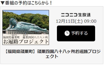 霊場の価値、篠栗町の魅力を知っていただくために、株式会社ドワンゴさんとタッグを組み、「ニコニコ生放送」で篠栗四国八十八ヶ所霊場の魅力を伝える番組を制作し、霊場の魅力を発信します!