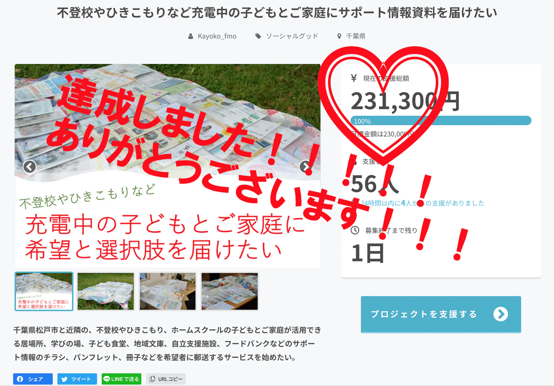 最終日の1日を残して、本日25日17時半に、目標金額の23万円を突破しました!!!