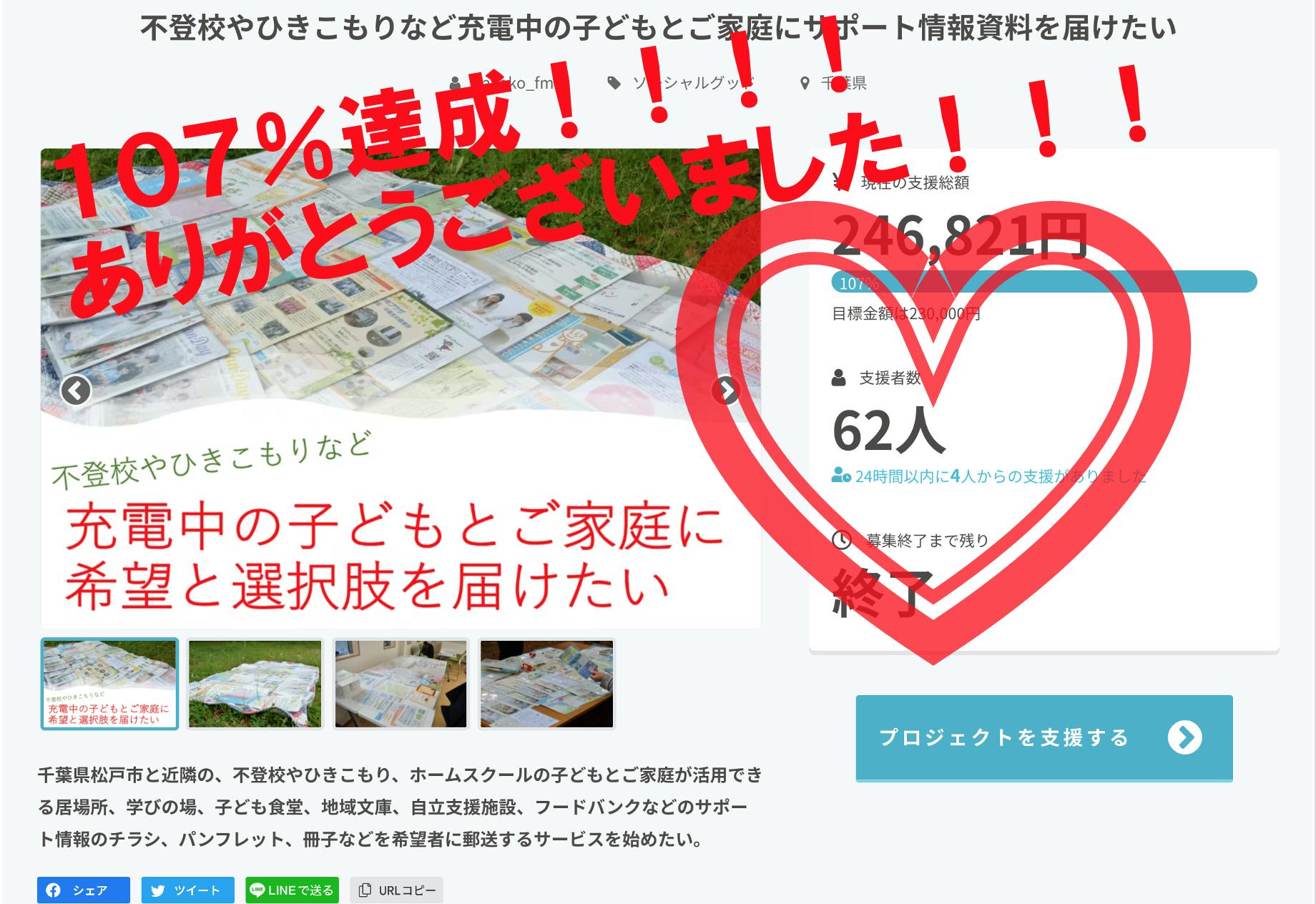 ご支援いただいたプロジェクトは、26日23:59に、62名、107%、246,821円ものご支援をいただき、無事に終了いたしました。応援ご支援いただいた皆さま、ほんとうにありがとうございました!