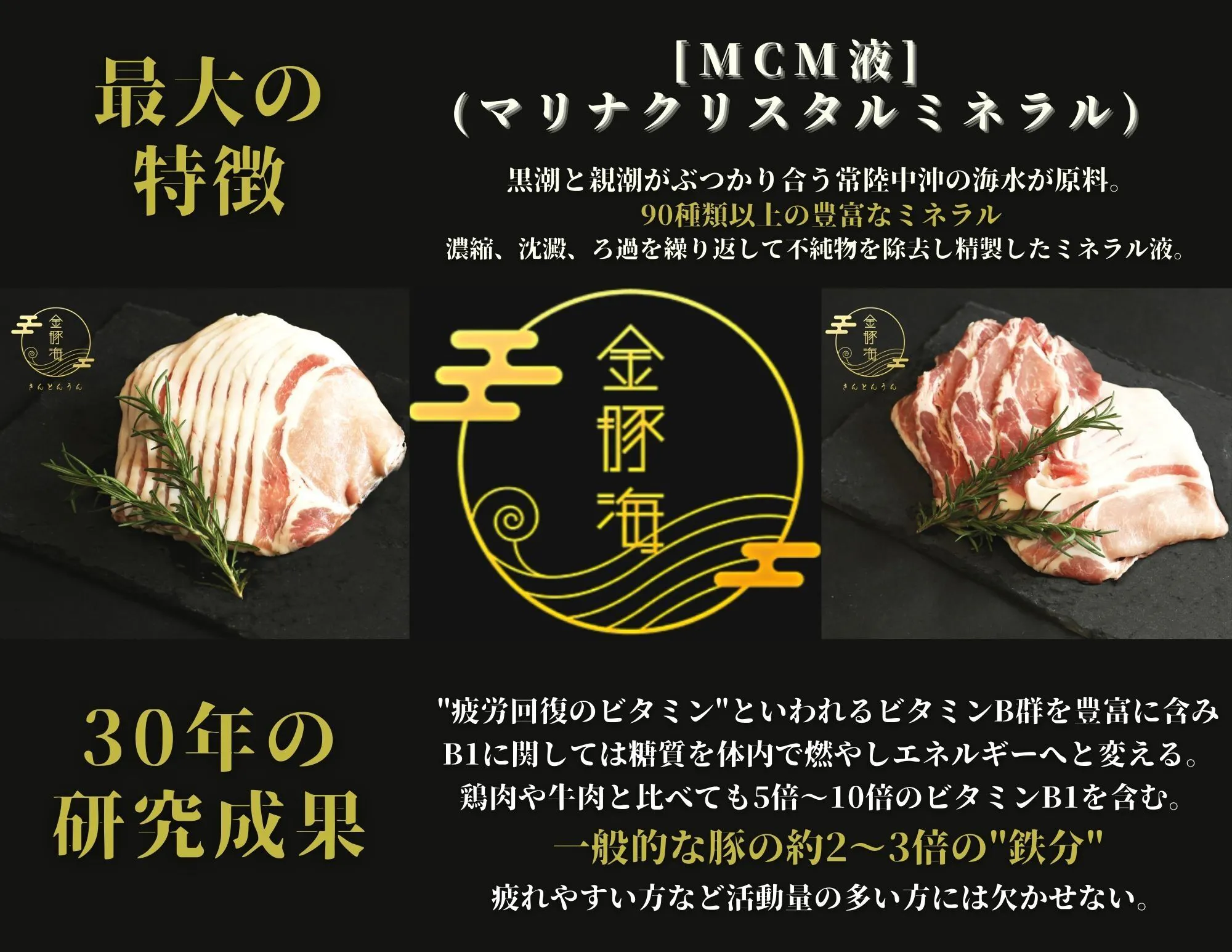 このMCM液を飲み水や餌に混ぜ与える事により、「金豚海」は一般の豚肉より約2~3倍のミネラルである"鉄"を含むスーパー豚に育つのです。