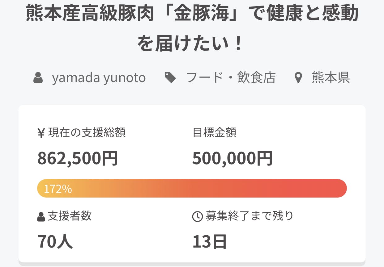 2021/12/07 09:00【中間でのご報告】「金豚海」のクラウドファンディングページをご覧になってくださっている皆様、誠にありがとうございます。公開から2週間が経ち、プロジェクトの半分を経過致しましたのでご報告をさせていただきます。現在のご支援金額862,500円支援者数70名目標達成率172%残日数13日上記となります。皆様のご支援により、プロジェクト公開3日目で目標達成率100%となり、更に多くの方よりご支援いただきまして目標達成率200%が見えてきました。多くの方に支えていただき大変感謝しつつ、早く皆さんに食べていただきたくワクワクしております。ご支援いただいた方々はリターンがご自宅にお届けできるまでしばらくお待ちくださいませ。引き続き、ご支援とご協力の程よろしくお願い申し上げます。株式会社ワクワククリエーション代表取締役 矢間太 結乃人 もっと見る