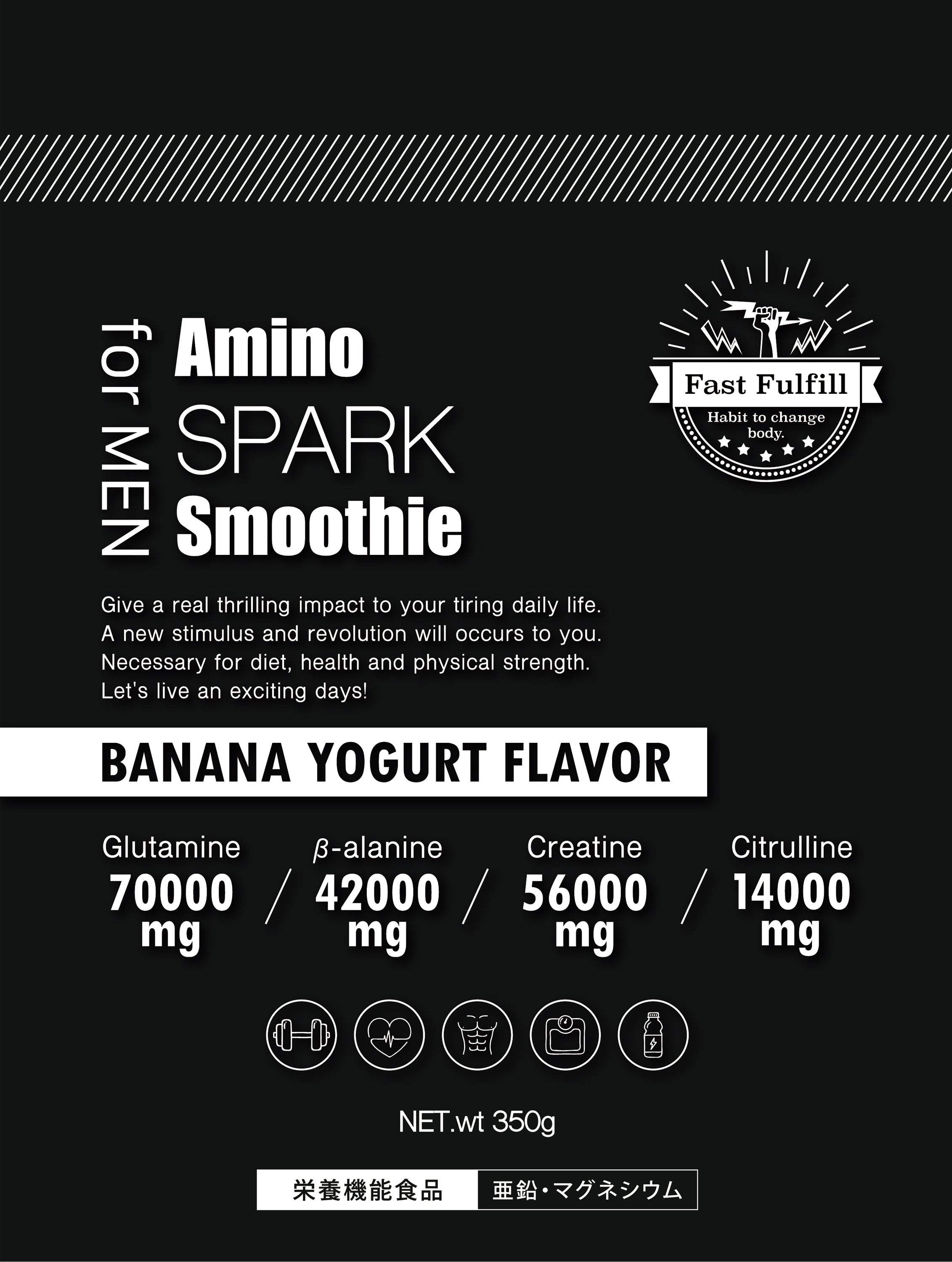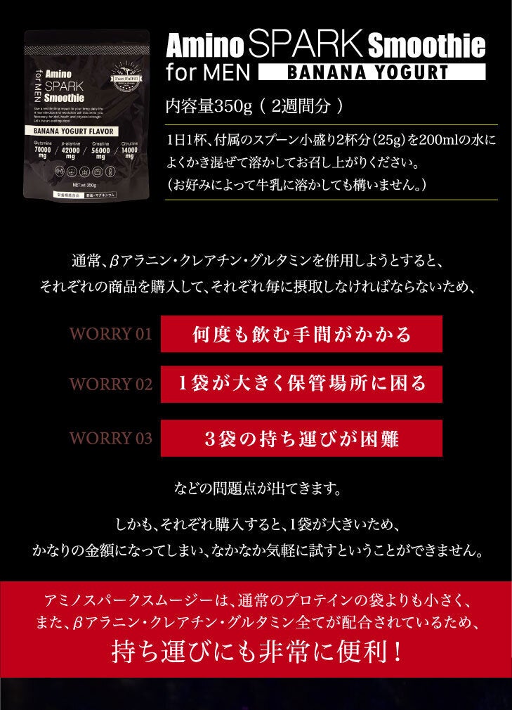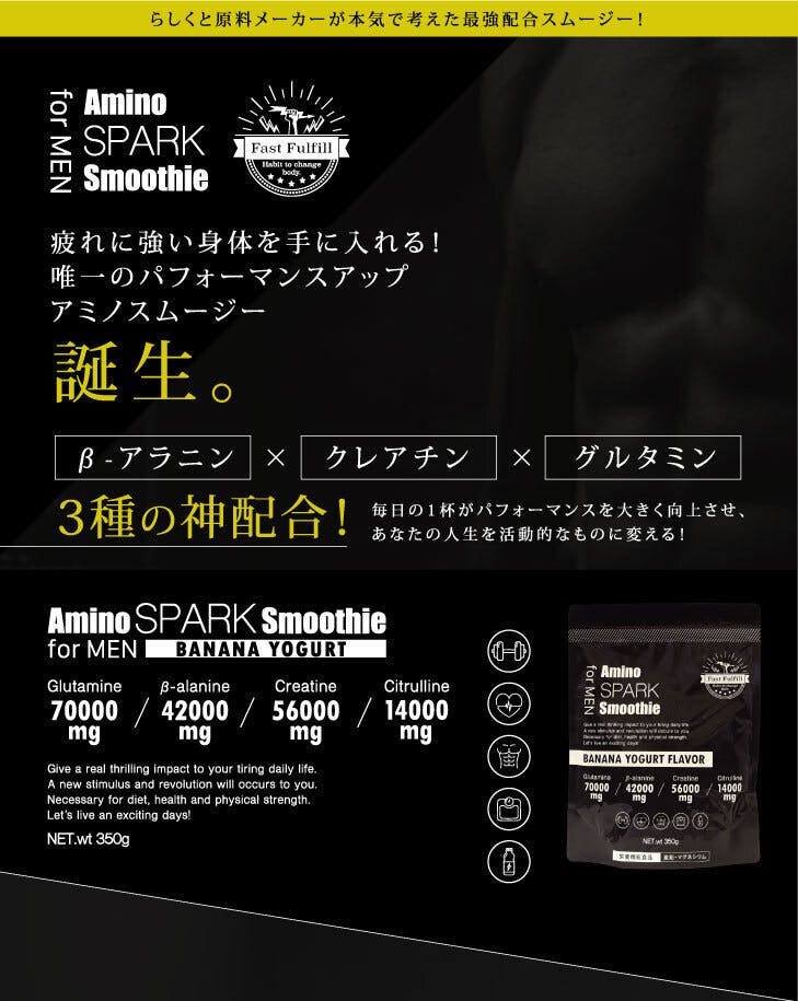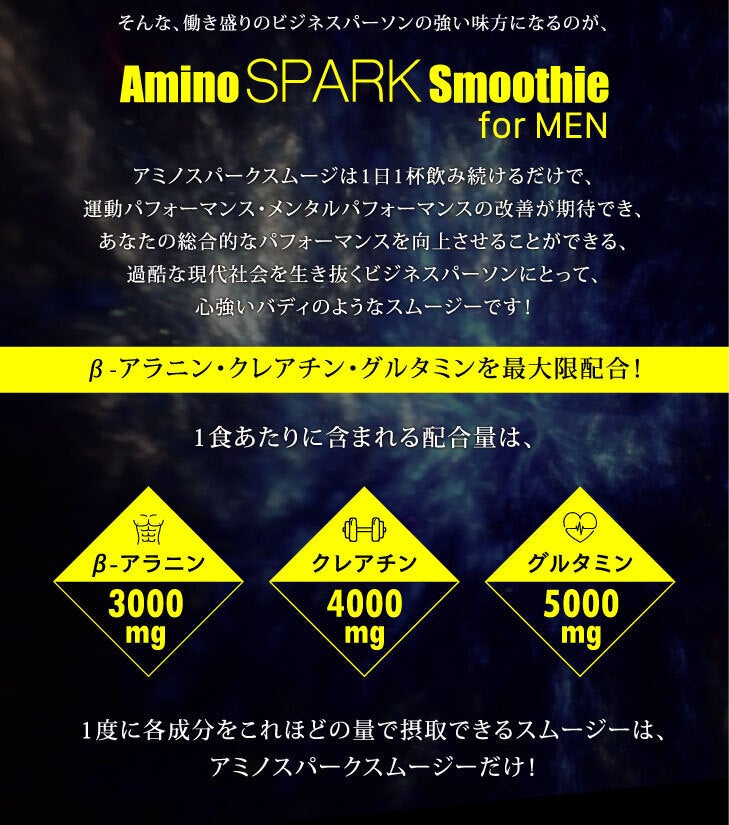 このアミノスパークスムージーはトレーニー以外の方にも広くベータアラニン・クレアチン・グルタミンの相乗効果を手軽に体験して、その有用性を実感していただくとともに、日々の生活をより活動的に過ごしていただきたい、そして、より多くの方に、仕事において、運動において、最高のパフォーマンスを発揮していただきたい、そのお手伝いをさせていただきたいという思いで商品を開発いたしました。