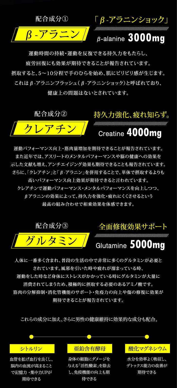 ベータアラニン(βアラニン)・クレアチン・グルタミンを最大限配合!